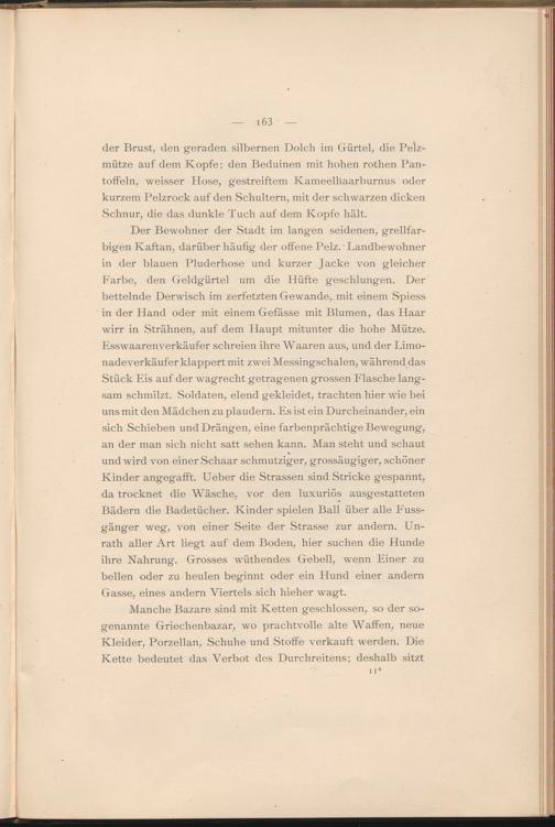 Der Bewohner der Stadt im langen seidenen, grellfarbigen Kaftan, darüber häufig der offene Pelz.' Landbewohner in der blauen Pluderhose und kurzer Jacke von gleicher Farbe, den Geldgürtel um die Hüfte geschlungen. Der bettelnde Derwisch im zerfetzten Gewände, mit einem Spiess in der Hand oder mit einem Gefässe mit Blumen, das Haar wirr in Strähnen, auf dem Haupt mitunter die hohe Mütze. Esswaarenverkäufer schreien ihre Waaren aus, und der Limonadeverkäufer klappert mit zwei Messingschalen, während das Stück Eis auf der wagrecht getragenen grossen Flasche langsam schmilzt. Soldaten, elend gekleidet, trachten hier wie bei uns mit den Mädchen zu plaudern. Es ist ein Durcheinander, ein sich Schieben und Drängen, eine farbenprächtige Bewegung, an der man sich nicht satt sehen kann. Man steht und schaut und wird von einer Schaar schmutziger, grossäugiger, schöner Kinder angegafft. Ueber die Strassen sind Stricke gespannt, da trocknet die Wäsche, vor den luxuriös ausgestatteten Bädern die Badetücher. Kinder spielen Ball über alle Fuss- gänger weg, von einer Seite der Strasse zur andern. Unrath aller Art liegt auf dem Boden, hier suchen die Hunde ihre Nahrung. Grosses wüthendes Gebell, wenn Einer zu bellen oder zu heulen beginnt oder ein Hund einer andern Gasse, eines andern Viertels sich hieher wagt.
