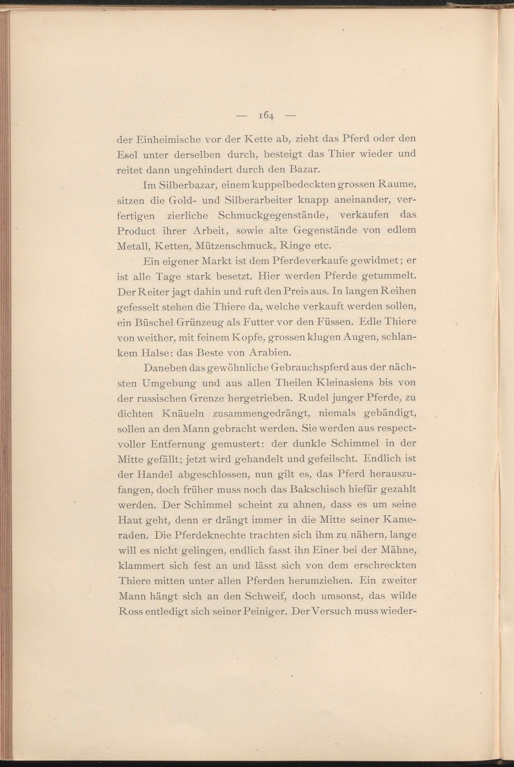 Daneben das gewöhnliche Gebrauchspferd aus der nächsten Umgebung und aus allen Theilen Kleinasiens bis von der russischen Grenze hergetrieben. Rudel junger Pferde, zu dichten Knäueln zusammengedrängt, niemals gebändigt, sollen an den Mann gebracht werden. Sie werden aus respect- voller Entfernung gemustert: der dunkle Schimmel in der Mitte gefällt; jetzt wird gehandelt und gefeilscht. Endlich ist der Handel abgeschlossen, nun gilt es, das Pferd herauszufangen, doch früher muss noch das Bakschisch hiefür gezahlt werden. Der Schimmel scheint zu ahnen, dass es um seine Haut geht, denn er drängt immer in die Mitte seiner Kameraden. Die Pferdeknechte trachten sich ihm zu nähern, lange will es nicht gelingen, endlich fasst ihn Einer bei der Mähne, klammert sich fest an und lässt sich von dem erschreckten Thiere mitten unter allen Pferden herumziehen. Ein zweiter Mann hängt sich an den Schweif, doch umsonst, das wilde Ross entledigt sich seiner Peiniger. Der Versuch muss wieder-