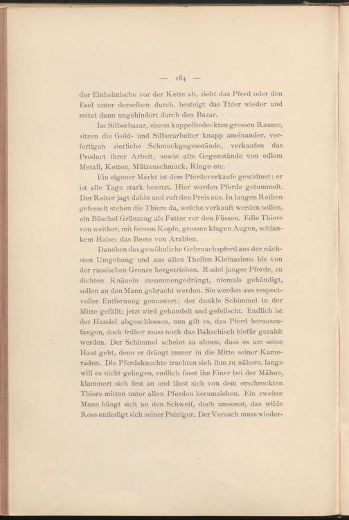 Ein eigener Markt ist dem Pferdeverkaufe gewidmet; er ist alle Tage stark besetzt. Hier werden Pferde getummelt. Der Reiter jagt dahin und ruft den Preis aus. In langen Reihen gefesselt stehen die Thiere da, welche verkauft werden sollen, ein Büschel Grünzeug als Futter vor den Füssen. Edle Thiere von weither, mit feinem Kopfe, grossen klugen Augen, schlankem Halse: das Beste von Arabien.
