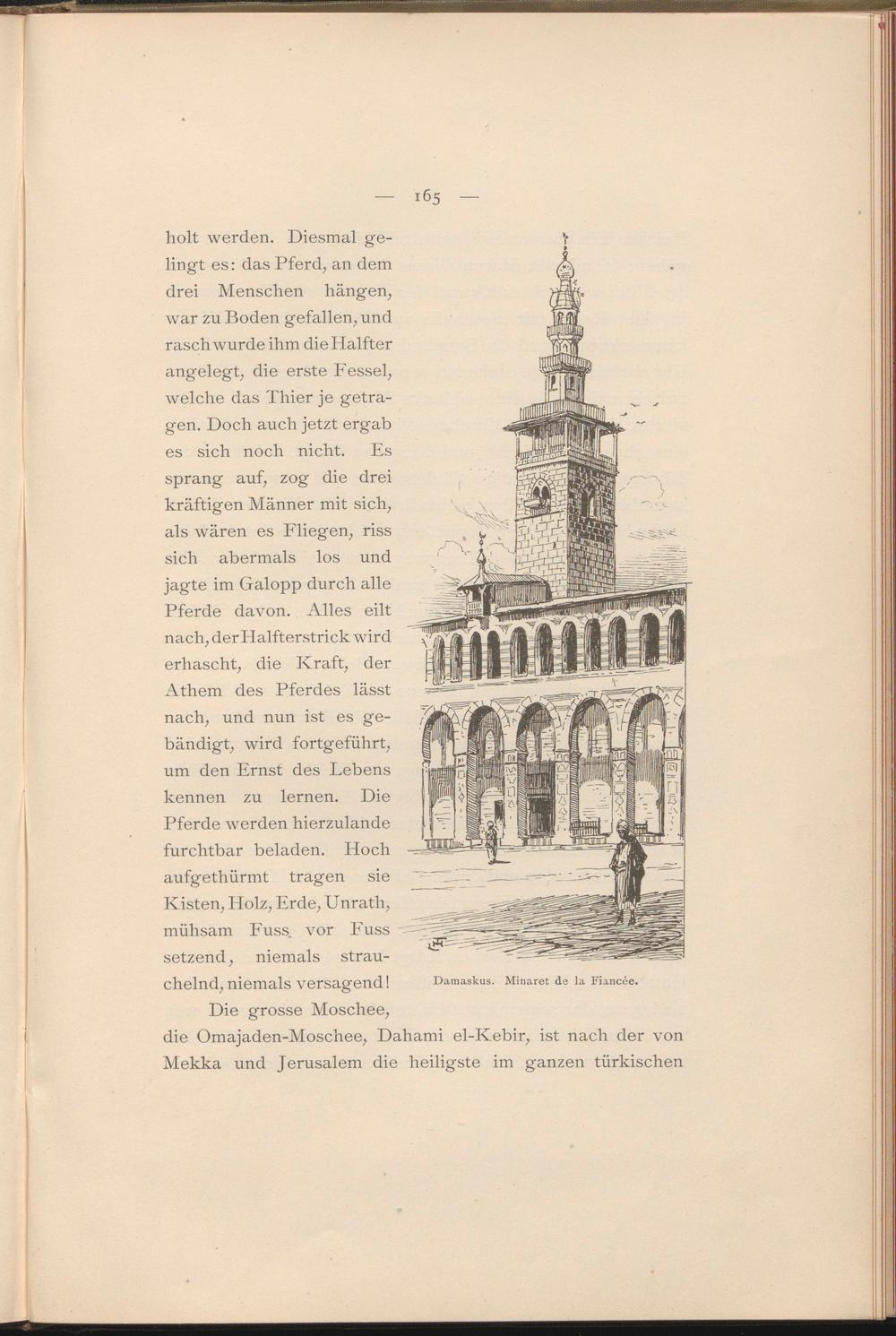 holt werden. Diesmal gelingt es: das Pferd, an dem drei Menschen hängen, war zu Boden gefallen, und rasch wurde ihm die Halfter angelegt, die erste Fessel, welche das Thier je getragen. Doch auch jetzt ergab es sich noch nicht. Es sprang auf, zog die drei kräftigen Männer mit sich, als wären es Fliegen, riss sich abermals los und jagte im Galopp durch alle Pferde davon. Alles eilt nach, der Halfterstrick wird erhascht, die Kraft, der Athem des Pferdes lässt nach, und nun ist es gebändigt, wird fortgeführt, um den Ernst des Lebens kennen zu lernen. Die Pferde werden hierzulande furchtbar beladen. Hoch aufgethürmt tragen sie Kisten, Holz, Erde, Unrath, mühsam Fuss. vor Fuss setzend, niemals strauchelnd, niemals versagend!