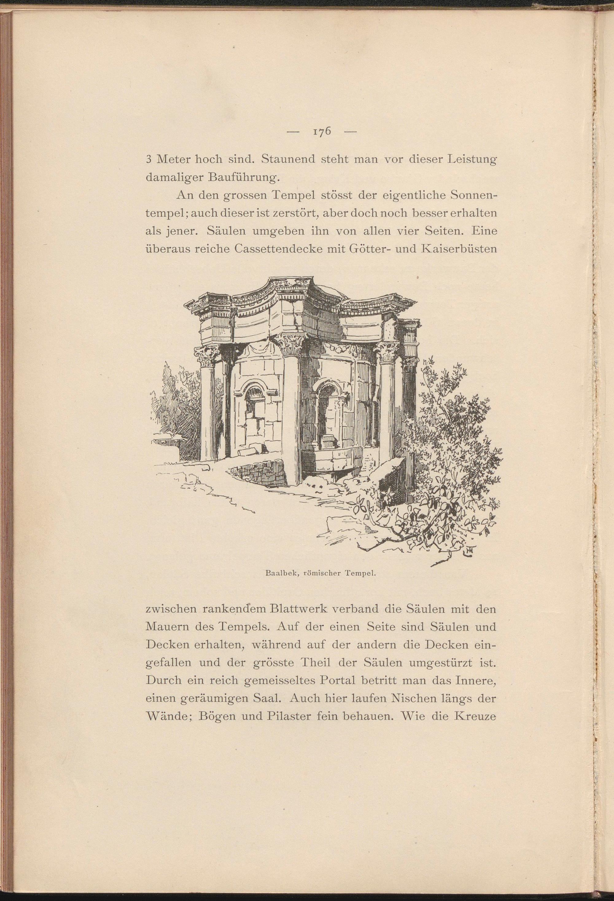 An den grossen Tempel stösst der eigentliche Sonnentempel; auch dieser ist zerstört, aber doch noch besser erhalten als jener. Säulen umgeben ihn von allen vier Seiten. Eine überaus reiche Cassettendecke mit Götter- und Kaiserbüsten