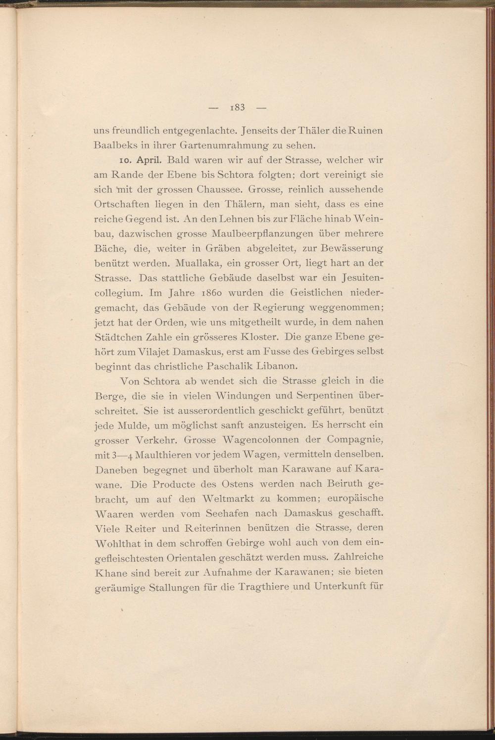 Von Schtora ab wendet sich die Strasse gleich in die Berge, die sie in vielen Windungen und Serpentinen überschreitet. Sie ist ausserordentlich geschickt geführt, benützt jede Mulde, um möglichst sanft anzusteigen. Es herrscht ein grosser Verkehr. Grosse Wagencolonnen der Compagnie, mit 3—4 Maulthieren vor jedem AVagen, vermitteln denselben. Daneben begegnet und überholt man Karawane auf Karawane. Die Producte des Ostens werden nach Beiruth gebracht, um auf den Weltmarkt zu kommen; europäische AVaaren werden vom Seehafen nach Damaskus geschafft. Viele Reiter und Reiterinnen benützen die Strasse, deren Wohlthat in dem schroffen Gebirge wohl auch von dem eingefleischtesten Orientalen geschätzt werden muss. Zahlreiche Khane sind bereit zur Aufnahme der Karawanen; sie bieten geräumige Stallungen für die Tragthiere und Unterkunft für