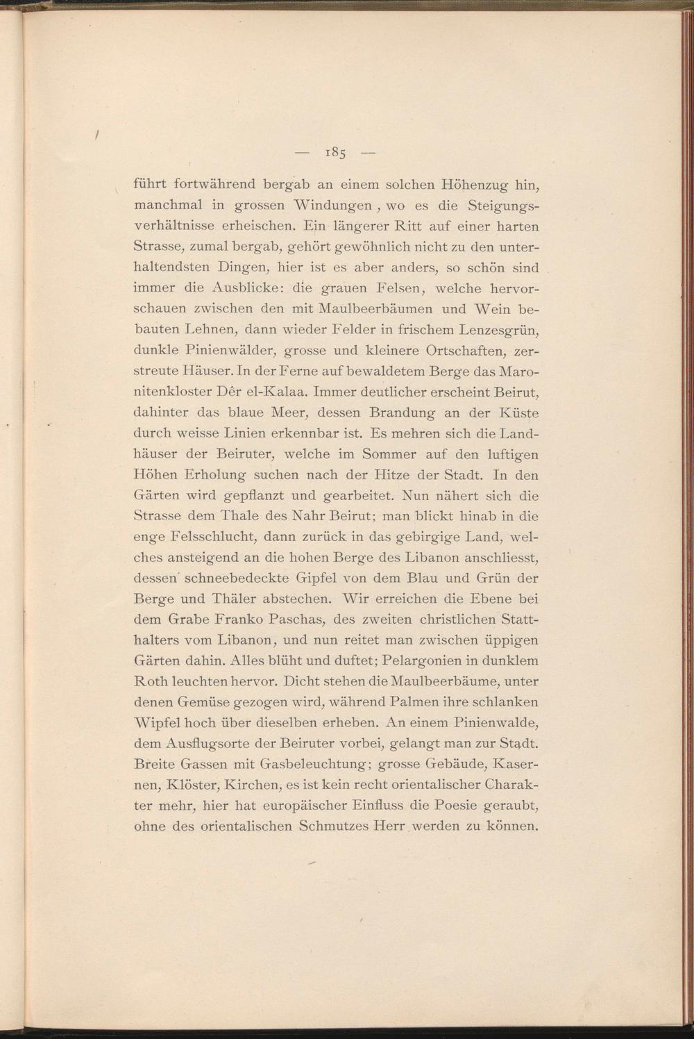 führt fortwährend bergab an einem solchen Höhenzug hin, manchmal in grossen Windungen , wo es die Steigungsverhältnisse erheischen. Ein längerer Ritt auf einer harten Strasse, zumal bergab, gehört gewöhnlich nicht zu den unterhaltendsten Dingen, hier ist es aber anders, so schön sind immer die Ausblicke: die grauen Felsen, welche hervorschauen zwischen den mit Maulbeerbäumen und Wein bebauten Lehnen, dann wieder Felder in frischem Lenzesgrün, dunkle Pinienwälder, grosse und kleinere Ortschaften, zerstreute Häuser. In der Ferne auf bewaldetem Berge das Maro- nitenkloster Der el-Kalaa. Immer deutlicher erscheint Beirut, dahinter das blaue Meer, dessen Brandung an der Küste durch weisse Linien erkennbar ist. Es mehren sich die Landhäuser der Beiruter, welche im Sommer auf den luftigen Höhen Erholung suchen nach der Hitze der Stadt. In den Gärten wird gepflanzt und gearbeitet. Nun nähert sich die Strasse dem Thale des Nähr Beirut; man blickt hinab in die enge Felsschlucht, dann zurück in das gebirgige Land, welches ansteigend an die hohen Berge des Libanon anschliesst, dessen schneebedeckte Gipfel von dem Blau und Grün der Berge und Thäler abstechen. Wir erreichen die Ebene bei dem Grabe Franko Paschas, des zweiten christlichen Statthalters vom Libanon, und nun reitet man zwischen üppigen Gärten dahin. Alles blüht und duftet; Pelargonien in dunklem Roth leuchten hervor. Dicht stehen die Maulbeerbäume, unter denen Gemüse gezogen wird, während Palmen ihre schlanken AVipfel hoch über dieselben erheben. An einem Pinienwalde, dem Ausflugsorte der Beiruter vorbei, gelangt man zur Stadt. Breite Gassen mit Gasbeleuchtung; grosse Gebäude, Kasernen, Klöster, Kirchen, es ist kein recht orientalischer Charakter mehr, hier hat europäischer Einfluss die Poesie geraubt, ohne des orientalischen Schmutzes Herr werden zu können.