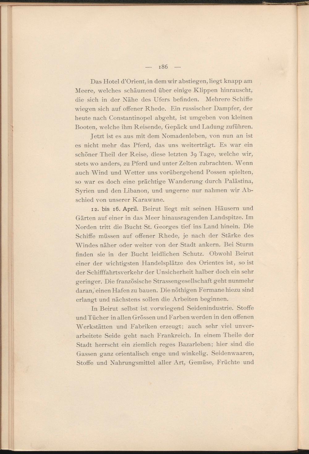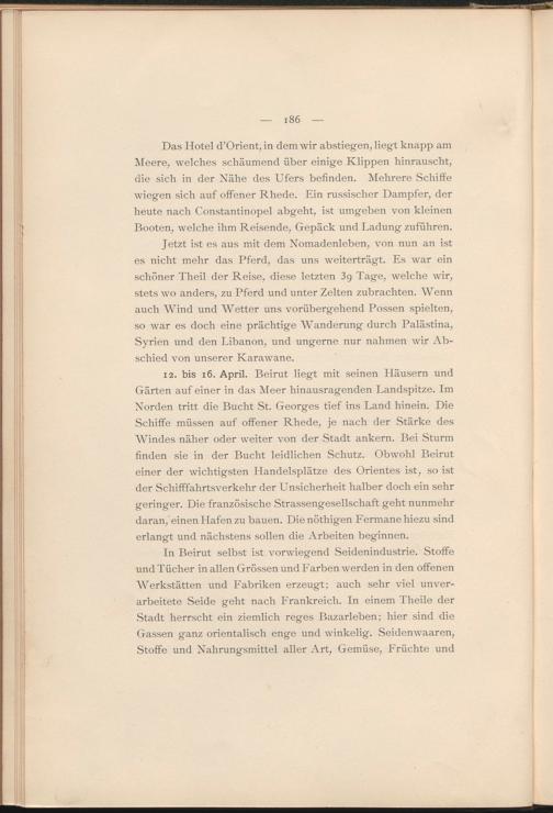 Jetzt ist es aus mit dem Nomadenleben, von nun an ist es nicht mehr das Pferd, das uns weiterträgt. Es war ein schöner Theil der Reise, diese letzten 3g Tage, welche wir, stets wo anders, zu Pferd und unter Zelten zubrachten. Wenn auch Wind und Wetter uns vorübergehend Possen spielten, so war es doch eine prächtige Wanderung durch Palästina, Syrien und den Libanon, und ungerne nur nahmen wir Abschied von unserer Karawane.