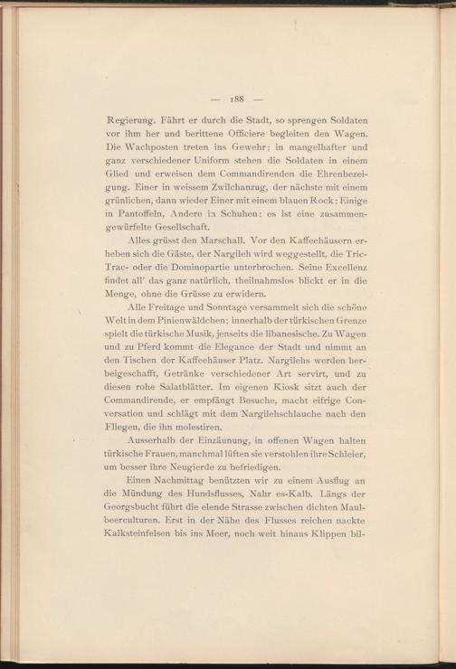 Alle Freitage und Sonntage versammelt sich die schöne Welt in dem Pinienwäldchen; innerhalb der türkischen Grenze spielt die türkische Musik, jenseits die libanesische. Zu Wagen und zu Pferd kommt die Elegance der Stadt und nimmt an den Tischen der Kaffeehäuser Platz. Nargilehs werden herbeigeschafft, Getränke verschiedener Art servirt, und zu diesen rohe Salatblätter. Im eigenen Kiosk sitzt auch der Commandirende, er empfängt Besuche, macht eifrige Con- versation und schlägt mit dem Nargilehschlauche nach den Fliegen, die ihn molestiren.
