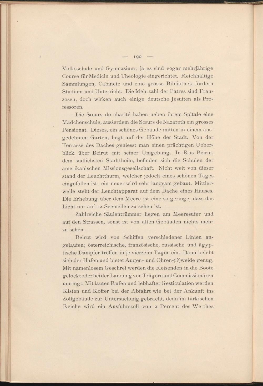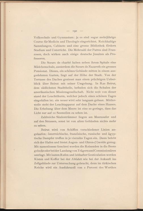 Die Sœurs de charité haben neben ihrem Spitale eine Mädchenschule, ausserdem die Sœurs de Nazareth ein grosses Pensionat. Dieses, ein schönes Gebäude mitten in einem ausgedehnten Garten, liegt auf der Höhe der Stadt. Von der Terrasse des Daches geniesst man einen prächtigen Ueber- blick über Beirut mit seiner Umgebung. In Ras Beirut, dem südlichsten Stadttheile, befinden sich die Schulen der amerikanischen Missionsgesellschaft. Nicht weit von dieser stand der Leuchtthurm, welcher jedoch eines schönen Tages eingefallen ist; ein neuer wird sehr langsam gebaut. Mittlerweile steht der Leuchtapparat auf dem Dache eines Hauses. Die Erhebung über dem Meere ist eine so geringe, dass das Licht nur auf 12 Seemeilen zu sehen ist.