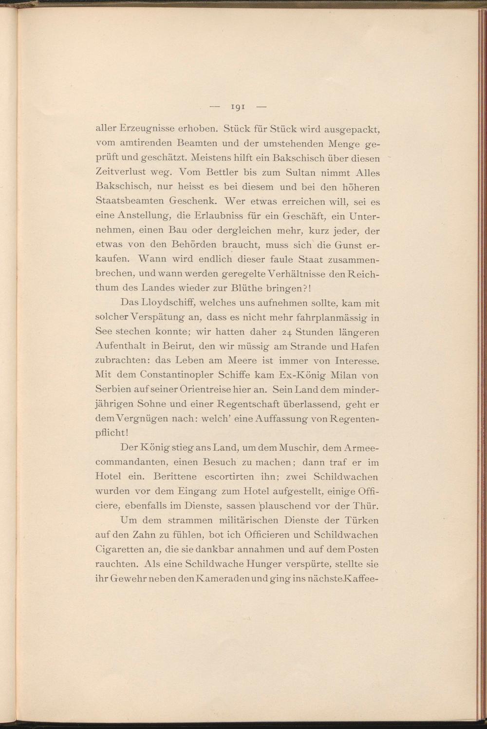 aller Erzeugnisse erhoben. Stück für Stück wird ausgepackt, vom amtirenden Beamten und der umstehenden Menge geprüft und geschätzt. Meistens hilft ein Bakschisch über diesen Zeitverlust weg. Vom Bettler bis zum Sultan nimmt Alles Bakschisch, nur heisst es bei diesem und bei den höheren Staatsbeamten Geschenk. Wer etwas erreichen will, sei es eine Anstellung, die Erlaubniss für ein Geschäft, ein Unternehmen, einen Bau oder dergleichen mehr, kurz jeder, der etwas von den Behörden braucht, muss sich die Gunst erkaufen. Wann wird endlich dieser faule Staat zusammenbrechen, und wann werden geregelte Verhältnisse den Reichthum des Landes wieder zur Blüthe bringen?!