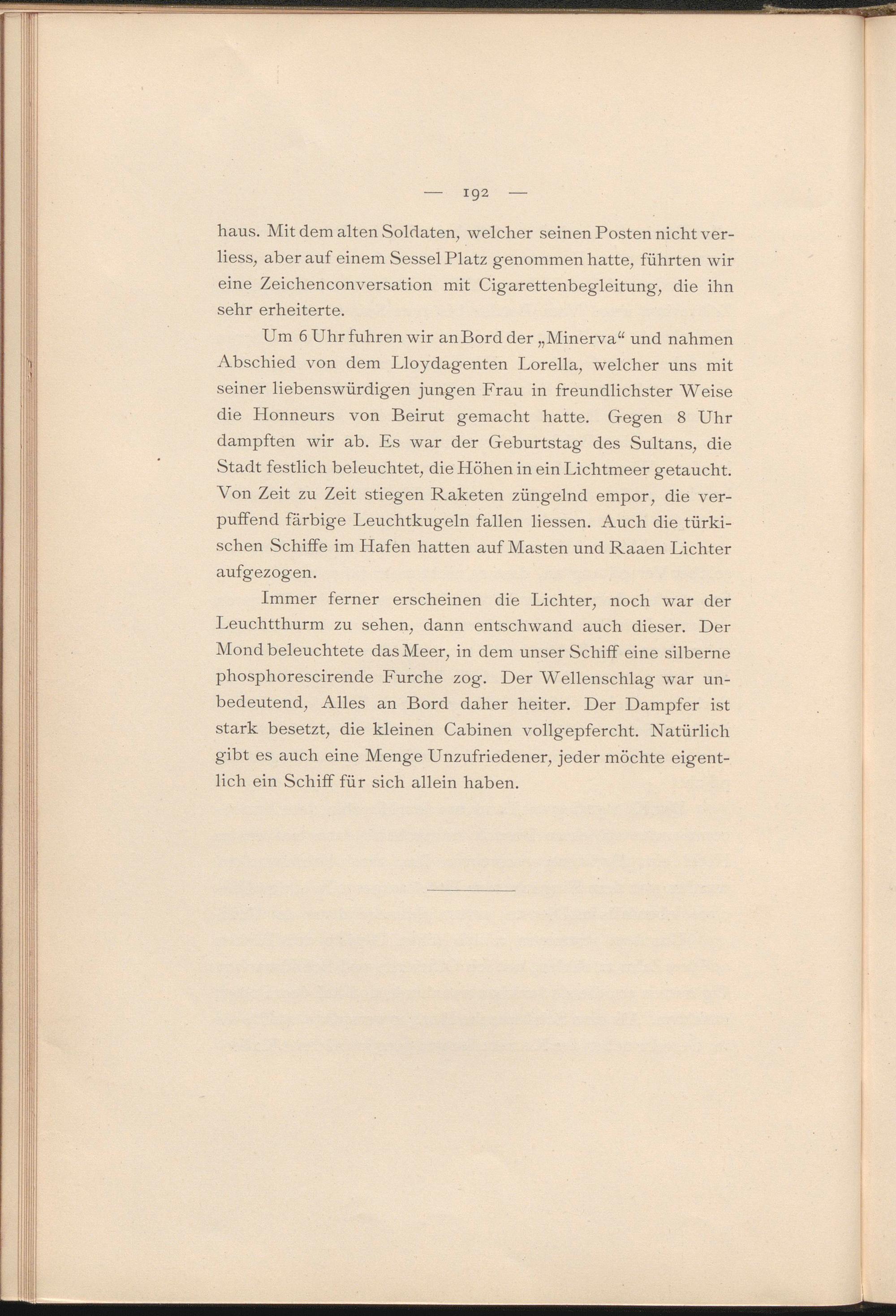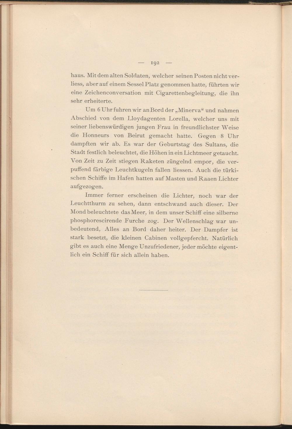 Um 6 Uhr fuhren wir anBordder „Minerva“ und nahmen Abschied von dem Lloydagenten Lorella, welcher uns mit seiner liebenswürdigen jungen Frau in freundlichster Weise die Honneurs von Beirut gemacht hatte. Gegen 8 Uhr dampften wir ab. Es war der Geburtstag des Sultans, die Stadt festlich beleuchtet, die Höhen in ein Lichtmeer getaucht. Von Zeit zu Zeit stiegen Raketen züngelnd empor, die verpuffend farbige Leuchtkugeln fallen liessen. Auch die türkischen Schiffe im Hafen hatten auf Masten und Raaen Lichter aufgezogen.