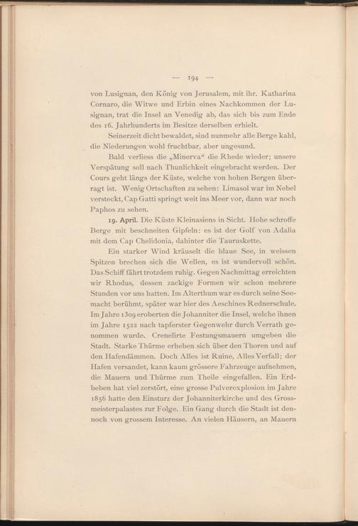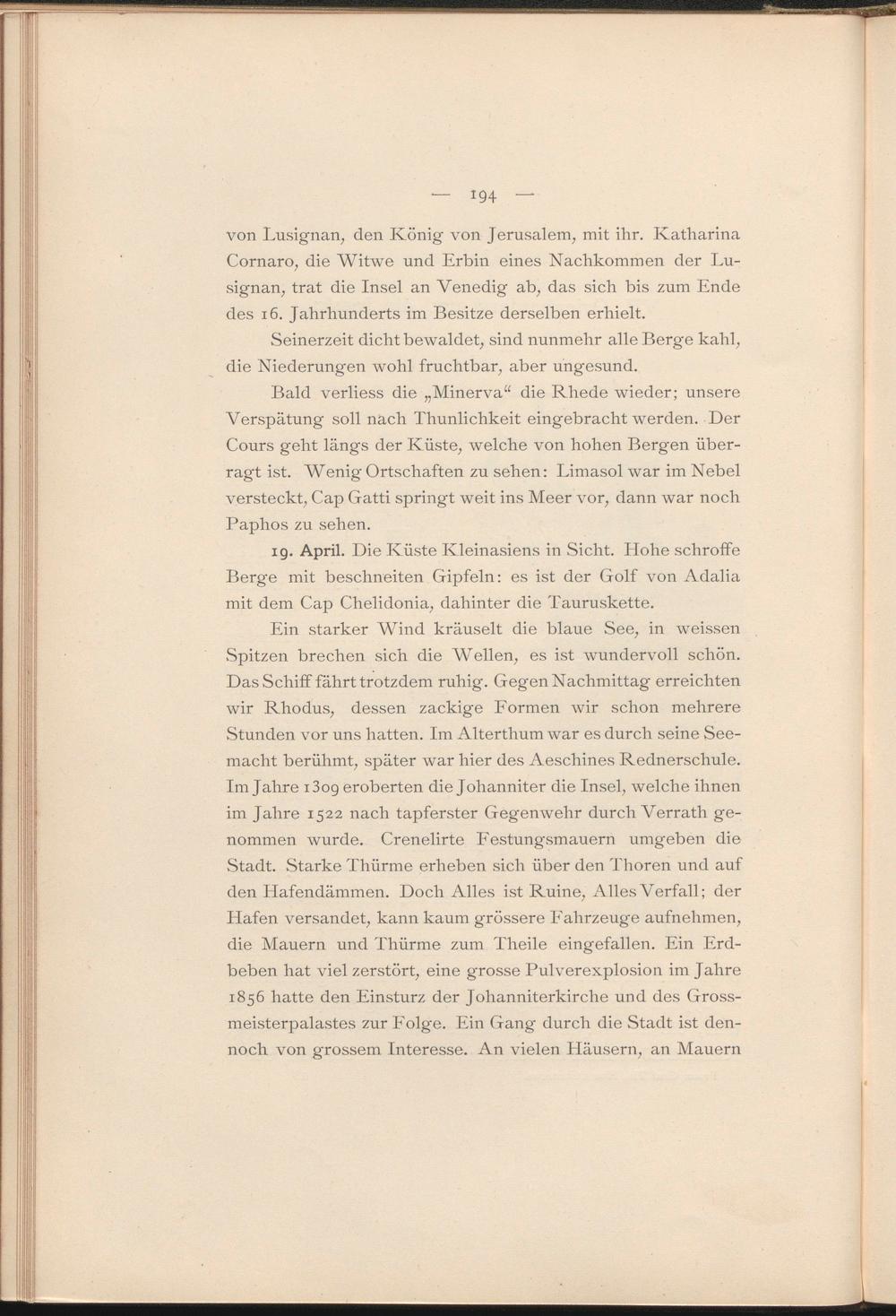 Ein starker Wind kräuselt die blaue See, in weissen Spitzen brechen sich die Wellen, es ist wundervoll schön. Das Schiff fährt trotzdem ruhig. Gegen Nachmittag erreichten wir Rhodus, dessen zackige Formen wir schon mehrere Stunden vor uns hatten. Im Alterthum war es durch seine Seemacht berühmt, später war hier des Aeschines Rednerschule. Im Jahre i3og eroberten die Johanniter die Insel, welche ihnen im Jahre 1522 nach tapferster Gegenwehr durch Verrath genommen wurde. Crenelirte Festungsmauern umgeben die Stadt. Starke Thürme erheben sich über den Thoren und auf den Hafendämmen. Doch Alles ist Ruine, iUles Verfall; der Hafen versandet, kann kaum grössere Fahrzeuge aufnehmen, die Mauern und Thürme zum Theile eingefallen. Ein Erdbeben hat viel zerstört, eine grosse Pulverexplosion im Jahre 1856 hatte den Einsturz der Johanniterkirche und des Grossmeisterpalastes zur Folge. Ein Gang durch die Stadt ist dennoch von grossem Interesse. An vielen Häusern, an Mauern