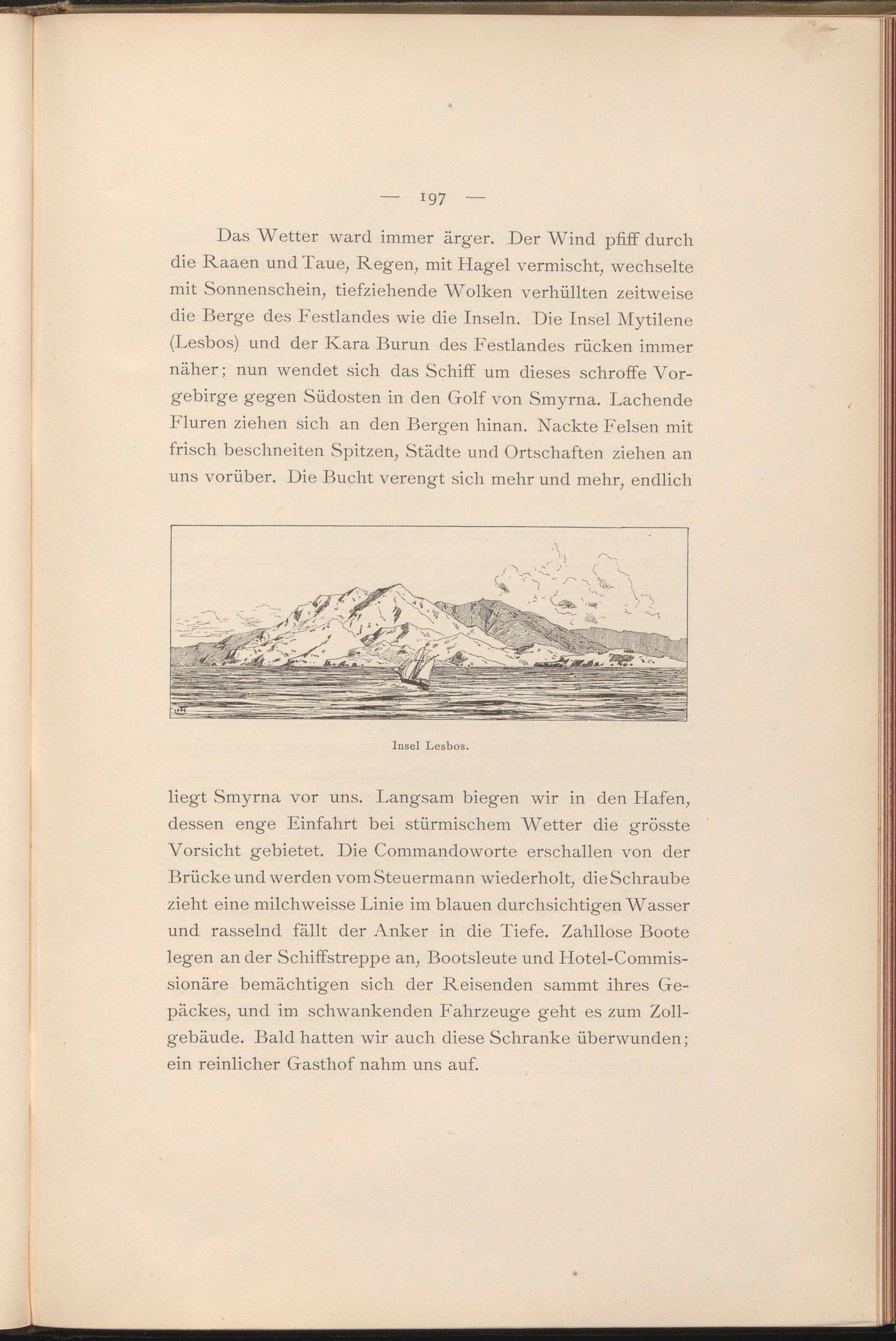 Das Wetter ward immer ärger. Der Wind pfiff durch die Raaen und Taue, Regen, mit Hagel vermischt, wechselte mit Sonnenschein, tiefziehende Wolken verhüllten zeitweise die Berge des Festlandes wie die Inseln. Die Insel Mytilene (Lesbos) und der Kara Burun des Festlandes rücken immer näher; nun wendet sich das Schiff um dieses schroffe Vorgebirge gegen Südosten in den Golf von Smyrna. Lachende Fluren ziehen sich an den Bergen hinan. Nackte Felsen mit frisch beschneiten Spitzen, Städte und Ortschaften ziehen an uns vorüber. Die Bucht verengt sich mehr und mehr, endlich