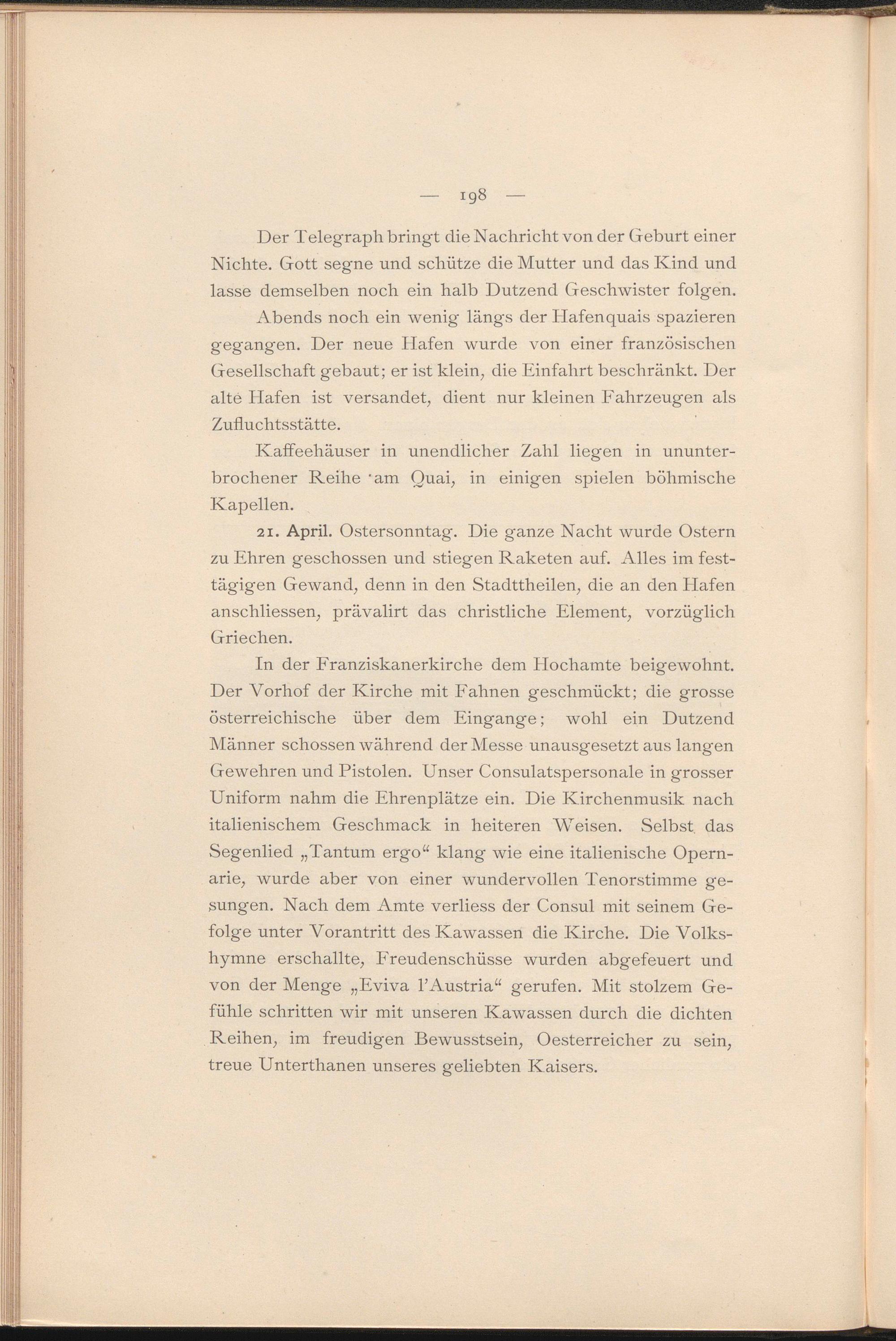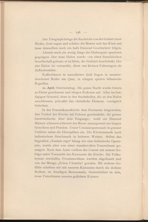In der Franziskanerkirche dem Hochamte beigewohnt. Der Vorhof der Kirche mit Fahnen geschmückt; die grosse österreichische über dem Eingänge; wohl ein Dutzend Männer schossen während der Messe unausgesetzt aus langen Gewehren und Pistolen. Unser Consulatspersonale in grosser Uniform nahm die Ehrenplätze ein. Die Kirchenmusik nach italienischem Geschmack in heiteren Weisen. Selbst das Segenlied „Tantum ergo“ klang wie eine italienische Opernarie, wurde aber von einer wundervollen Tenorstimme gesungen. Nach dem Amte verliess der Consul mit seinem Gefolge unter Vorantritt des Kawassen die Kirche. Die Volkshymne erschallte, Freudenschüsse wurden abgefeuert und von der Menge „Eviva 1’Austria“ gerufen. Mit stolzem Gefühle schritten wir mit unseren Kawassen durch die dichten Reihen, im freudigen Bewusstsein, Oesterreicher zu sein, treue Unterthanen unseres geliebten Kaisers.