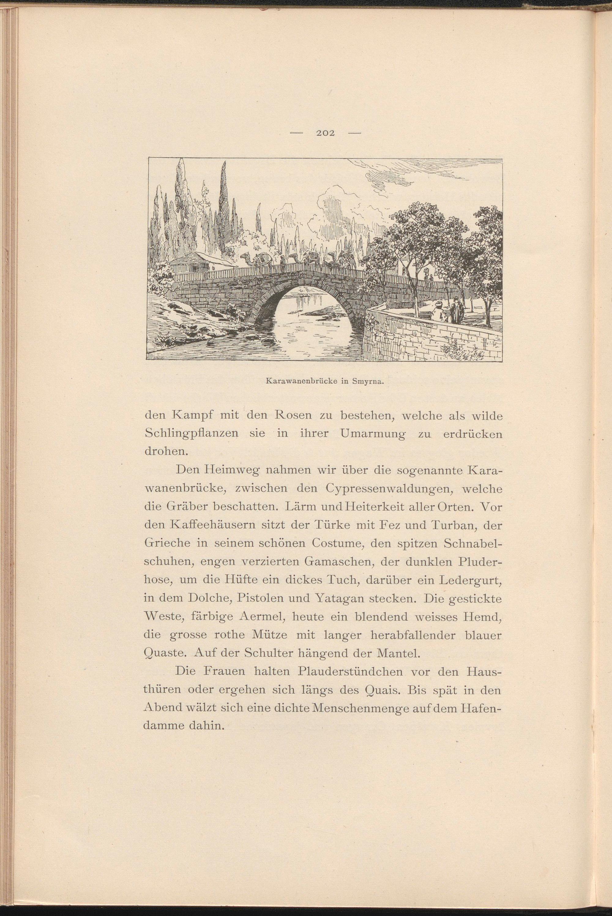 Den Heimweg nahmen wir über die sogenannte Karawanenbrücke, zwischen den Cypressenwaldungen, welche die Gräber beschatten. Lärm und Heiterkeit aller Orten. Vor den Kaffeehäusern sitzt der Türke mit Fez und Turban, der Grieche in seinem schönen Costume, den spitzen Schnabelschuhen, engen verzierten Gamaschen, der dunklen Pluderhose, um die Hüfte ein dickes Tuch, darüber ein Ledergurt, in dem Dolche, Pistolen und Yatagan stecken. Die gestickte Weste, färbige Aermel, heute ein blendend weisses Hemd, die grosse rothe Mütze mit langer herabfallender blauer Quaste. Auf der Schulter hängend der Mantel.