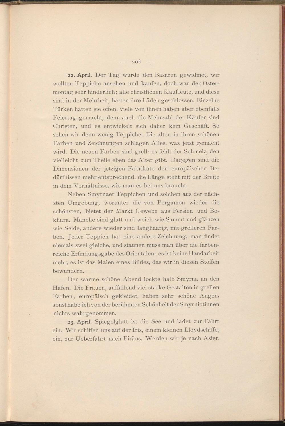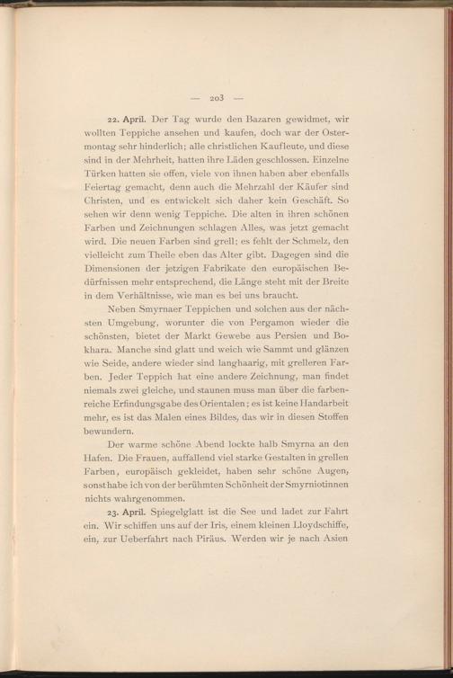23. April. Spiegelglatt ist die See und ladet zur Fahrt ein. Wir schiffen uns auf der Iris, einem kleinen Lloydschiffe, ein, zur Ueberfahrt nach Piräus. Werden wir je nach Asien