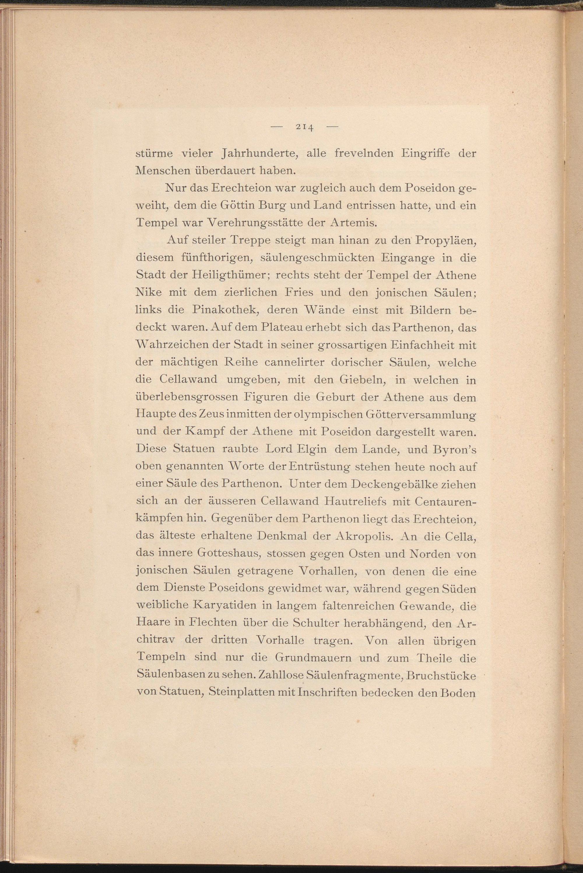 Auf steiler Treppe steigt man hinan zu den Propyläen, diesem fünfthorigen, säulengeschmückten Eingänge in die Stadt der Heiligthümer; rechts steht der Tempel der Athene Nike mit dem zierlichen Fries und den jonischen Säulen; links die Pinakothek, deren Wände einst mit Bildern bedeckt waren. Auf dem Plateau erhebt sich das Parthenon, das Wahrzeichen der Stadt in seiner grossartigen Einfachheit mit der mächtigen Reihe cannelirter dorischer Säulen, welche die Cellawand umgeben, mit den Giebeln, in welchen in überlebensgrossen Figuren die Geburt der Athene aus dem Haupte des Zeus inmitten der olympischen Götterversammlung und der Kampf der Athene mit Poseidon dargestellt waren. Diese Statuen raubte Lord Eigin dem Lande, und Byron’s oben genannten Worte der Entrüstung stehen heute noch auf einer Säule des Parthenon. Unter dem Deckengebälke ziehen sich an der äusseren Cellawand Hautreliefs mit Centaurenkämpfen hin. Gegenüber dem Parthenon liegt das Erechteion, das älteste erhaltene Denkmal der Akropolis. An die Cella, das innere Gotteshaus, stossen gegen Osten und Norden von jonischen Säulen getragene Vorhallen, von denen die eine dem Dienste Poseidons gewidmet war, während gegen Süden weibliche Karyatiden in langem faltenreichen Gewände, die Haare in Flechten über die Schulter herabhängend, den Ar- chitrav der dritten Vorhalle tragen. Von allen übrigen Tempeln sind nur die Grundmauern und zum Theile die Säulenbasen zu sehen. Zahllose Säulenfragmente, Bruchstücke von Statuen, Steinplatten mit Inschriften bedecken den Boden