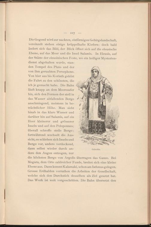 Von hier aus bis Korinth gehört die Fahrt zu den schönsten, die ich je gemacht habe. Die Bahn läuft knapp an dem Meeresufer hin, sich den Formen der steil in das Wasser abfallenden Berge anschmiegend, meistens in beträchtlicher Höhe. Man sieht hinab in das klare Wasser und darüber hin auf Salamis, auf ein Heer kleinerer und grösserer Inseln und auf den Peloponnes; überall schroffe steile Berge; fortwährend wechselt die Aussicht, es schieben sich Inseln und Berge vor, andere verdeckend, dann selbst wieder durch andere den Augen entzogen, nur die höchsten Berge von Argolis überragen das Ganze. Bei Megara, dem Orte zahlreicher Funde, breitet sich eine kleine Ebene aus. Dann kommt Kalamaki, schon am Isthmus gelegen. Grosse Erdhalden verrathen die Arbeiten der Gesellschaft, welche sich den Durchstich desselben als Ziel gesetzt hat. Das Werk ist weit vorgeschritten. Die Bahn übersetzt den