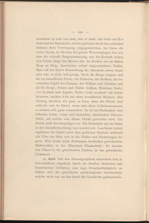 bezaubert zu sein von dem, was er sieht: der Golf von Korinth und der Saronische, welche getrennt durch den schmalen Isthmus ihrer Vereinigung entgegenstreben. Im Osten die vielen Inseln, im Westen der grosse Wasserspiegel, hier wie dort die schroffe Bergeseinfassung, nur bei Korinth ziehen sich Felder längs des Meeres hin. Im Norden wie im Süden Berg an Berg, dazwischen scharf eingeschnittene Thäler. Man soll bei klarer Beleuchtung die Akropolis sehen, heute aber war es nicht hell genug. Doch die Berge zeigten sich bis zur unendlichen Ferne; der Kitheron, der Helikon, die beschneiten Gipfel des Parnass, der Killene und Chelmos und all die Berge, Felsen und Thäler Attikas, Böotiens, Doris’, von Korinth und Argolis. Helles Licht wechselt mit tiefem Schatten, nackter Fels mit dünn bewaldetem Rücken. Den Abstieg machten wir ganz zu Fuss, denn die Pferde sind schlecht und die Sättel, wenn man diese Folterinstrumente so nennen will, ganz schauerlich. Es ist ein Packsattel; eine hölzerne Lehne vorne und rückwärts, dazwischen hölzerne Stäbe, auf welche eine dünne Decke geworfen wird. Ein Strick stellt den Steigbügel vor. Die Heimfahrt mit der Bahn in der Abendbeleuchtung war wundervoll. Leuchtend violett erglänzen die Gipfel unter dem goldenen Himmel, während alle Töne des Blau sich in die Thäler und Niederungen lagern. Wer kennt nicht Rottmanns herrlichen griechischen Bildercyklus in der Münchner Pinakothek ? Er tauchte den Pinsel in die griechischen Farben, in das griechische Lichtmeer.