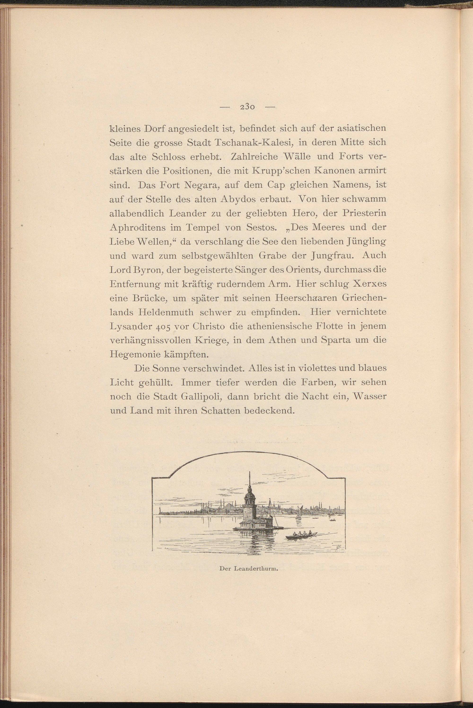 kleines Dorf angesiedelt ist, befindet sich auf der asiatischen Seite die grosse Stadt Tschanak-Kalesi, in deren Mitte sich das alte Schloss erhebt. Zahlreiche Wälle und Forts verstärken die Positionen, die mit Krupp’schen Kanonen armirt sind. Das Fort Negara, auf dem Cap gleichen Namens, ist auf der Stelle des alten Abydos erbaut. Von hier schwamm allabendlich Leander zu der geliebten Hero, der Priesterin Aphroditens im Tempel von Sestos. „Des Meeres und der Liebe Wellen,“ da verschlang die See den liebenden Jüngling und ward zum selbstgewählten Grabe der Jungfrau. Auch Lord Byron, der begeisterte Sänger des Orients, durchmass die Entfernung mit kräftig ruderndem Arm. Hier schlug Xerxes eine Brücke, um später mit seinen Heerschaaren Griechenlands Heldenmuth schwer zu empfinden. Hier vernichtete Lysander 405 vor Christo die atheniensische Flotte in jenem verhängnissvollen Kriege, in dem Athen und Sparta um die Hegemonie kämpften.