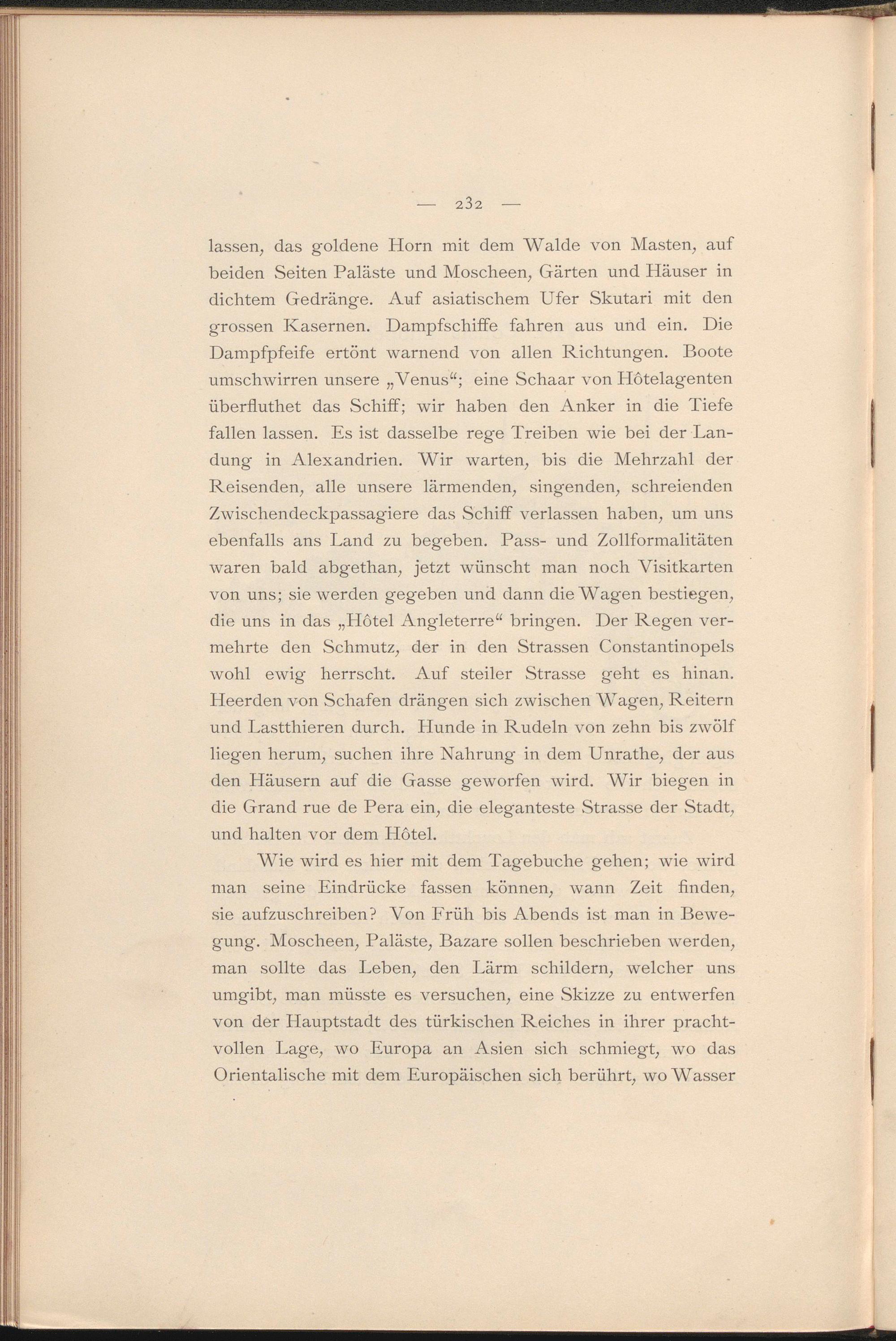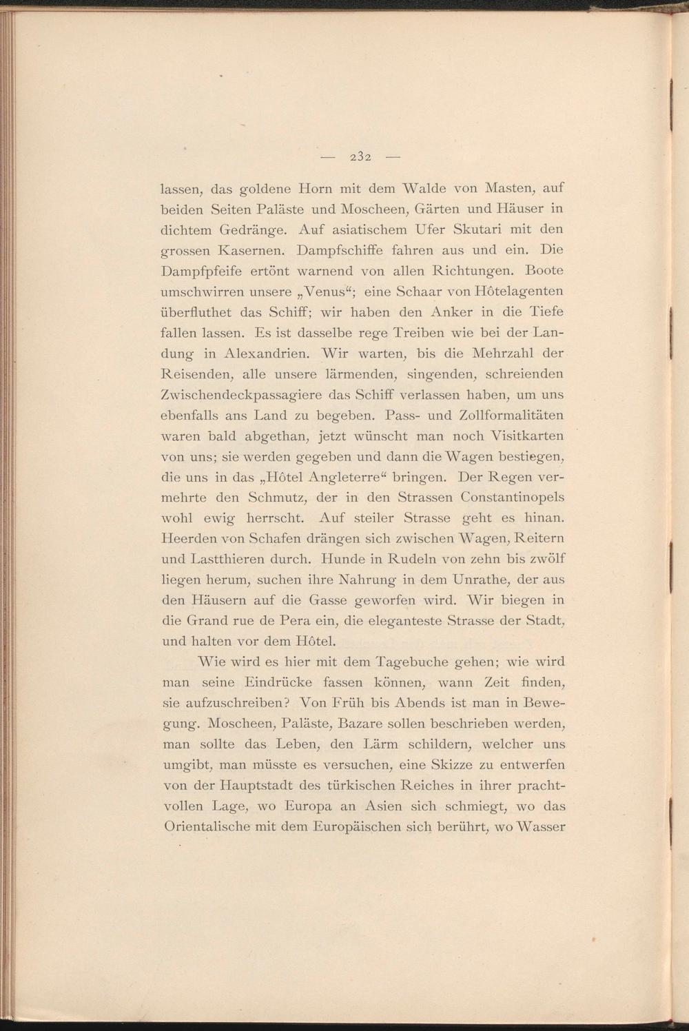 lassen, das goldene Horn mit dem Walde von Masten, auf beiden Seiten Paläste und Moscheen, Gärten und Häuser in dichtem Gedränge. Auf asiatischem Ufer Skutari mit den grossen Kasernen. Dampfschiffe fahren aus und ein. Die Dampfpfeife ertönt warnend von allen Richtungen. Boote umschwirren unsere „Venus“; eine Schaar von Hotelagenten überfluthet das Schiff; wir haben den Anker in die Tiefe fallen lassen. Es ist dasselbe rege Treiben wie bei der Landung in Alexandrien. Wir warten, bis die Mehrzahl der Reisenden, alle unsere lärmenden, singenden, schreienden Zwischendeckpassagiere das Schiff verlassen haben, um uns ebenfalls ans Land zu begeben. Pass- und Zollformalitäten waren bald abgethan, jetzt wünscht man noch Visitkarten von uns; sie werden gegeben und dann die Wagen bestiegen, die uns in das „Hotel Angleterre“ bringen. Der Regen vermehrte den Schmutz, der in den Strassen Constantinopels wohl ewig herrscht. Auf steiler Strasse geht es hinan. Heerden von Schafen drängen sich zwischen Wagen, Reitern und Lastthieren durch. Hunde in Rudeln von zehn bis zwölf liegen herum, suchen ihre Nahrung in dem Unrathe, der aus den Häusern auf die Gasse geworfen wird. Wir biegen in die Grand rue de Pera ein, die eleganteste Strasse der Stadt, und halten vor dem Llötel.