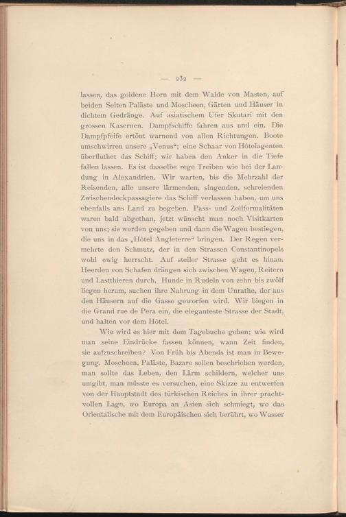 Wie wird es hier mit dem Tagebuche gehen; wie wird man seine Eindrücke fassen können, wann Zeit finden, sie aufzuschreiben? Von Früh bis Abends ist man in Bewegung. Moscheen, Paläste, Bazare sollen beschrieben werden, man sollte das Leben, den Lärm schildern, welcher uns umgibt, man müsste es versuchen, eine Skizze zu entwerfen von der Hauptstadt des türkischen Reiches in ihrer prachtvollen Lage, wo Europa an Asien sich schmiegt, wo das Orientalische mit dem Europäischen sich berührt, wo Wasser