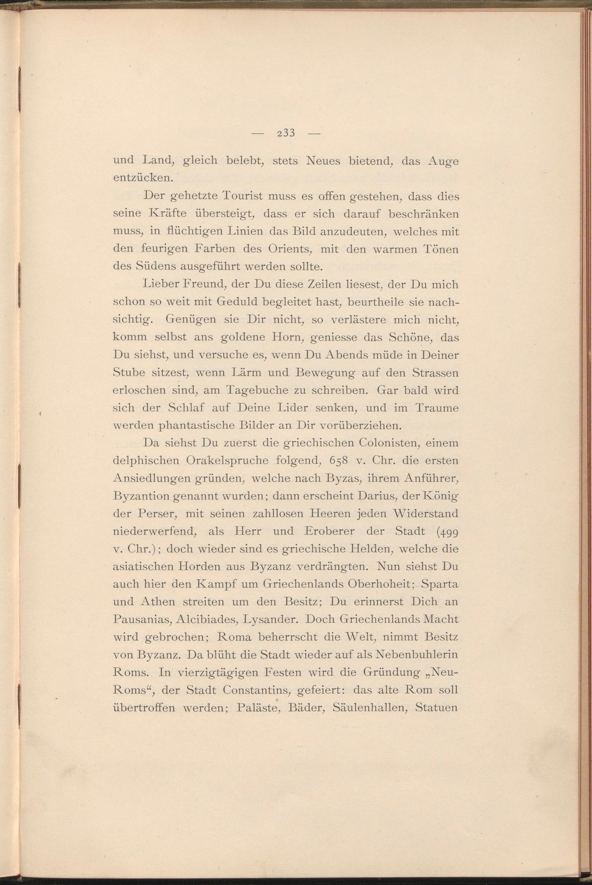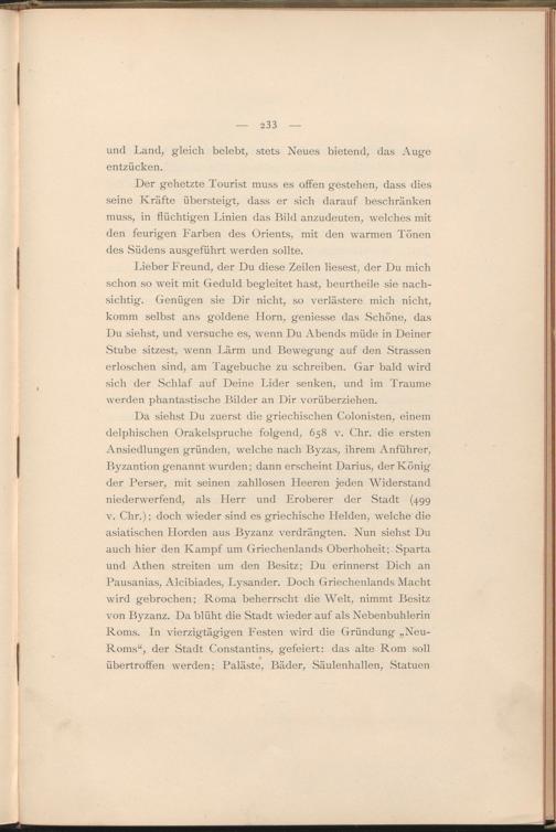 Lieber Freund, der Du diese Zeilen liesest, der Du mich schon so weit mit Geduld begleitet hast, beurtheile sie nachsichtig. Genügen sie Dir nicht, so verlästere mich nicht, komm selbst ans goldene Horn, geniesse das Schöne, das Du siehst, und versuche es, wenn Du Abends müde in Deiner Stube sitzest, wenn Lärm und Bewegung auf den Strassen erloschen sind, am Tagebuche zu schreiben. Gar bald wird sich der Schlaf auf Deine Lider senken, und im Traume werden phantastische Bilder an Dir vorüberziehen.