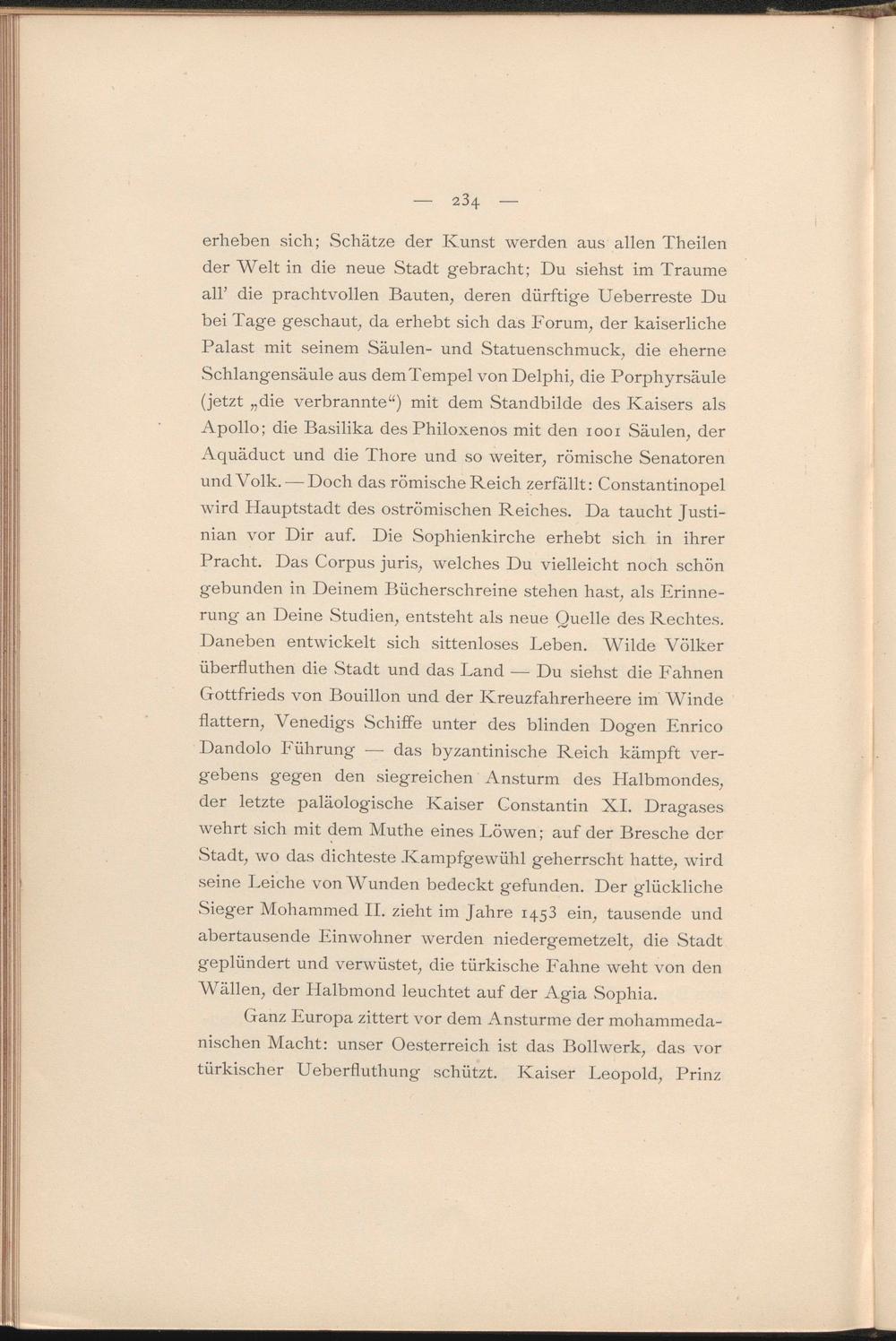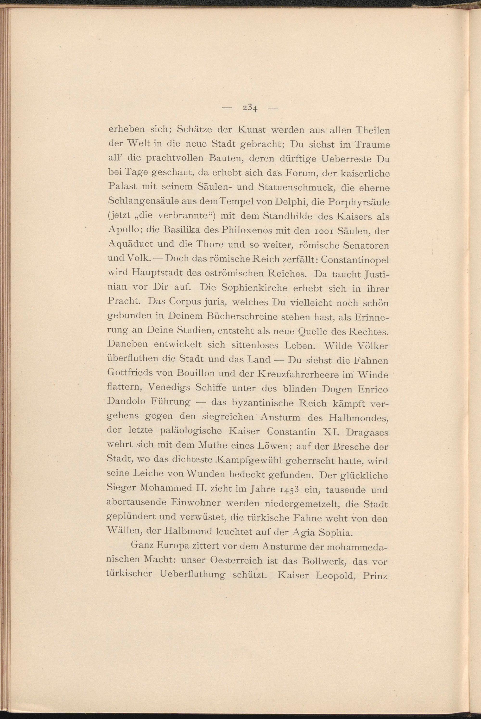 erheben sich; Schätze der Kunst werden aus allen Theilen der Welt in die neue Stadt gebracht; Du siehst im Traume all’ die prachtvollen Bauten, deren dürftige Ueberreste Du bei Tage geschaut, da erhebt sich das Forum, der kaiserliche Palast mit seinem Säulen- und Statuenschmuck, die eherne Schlangensäule aus dem Tempel von Delphi, die Porphyrsäule (jetzt „die verbrannte“) mit dem Standbilde des Kaisers als Apollo; die Basilika des Philoxenos mit den 1001 Säulen, der Aquäduct und die Thore und so weiter, römische Senatoren und Volk. — Doch das römische Reich zerfällt: Constantinopel wird Hauptstadt des oströmischen Reiches. Da taucht Justi- nian vor Dir auf. Die Sophienkirche erhebt sich in ihrer Pracht. Das Corpus juris, welches Du vielleicht noch schön gebunden in Deinem Bücherschreine stehen hast, als Erinnerung an Deine Studien, entsteht als neue Quelle des Rechtes. Daneben entwickelt sich sittenloses Leben. Wilde Völker überfluthen die Stadt und das Land — Du siehst die Fahnen Gottfrieds von Bouillon und der Kreuzfahrerheere im Winde flattern, Venedigs Schiffe unter des blinden Dogen Enrico Dandolo Führung — das byzantinische Reich kämpft vergebens gegen den siegreichen Ansturm des Halbmondes, der letzte paläologische Kaiser Constantin XI. Dragases wehrt sich mit dem Muthe eines Löwen; auf der Bresche der Stadt, wo das dichteste Kampfgewühl geherrscht hatte, wird seine Leiche von Wunden bedeckt gefunden. Der glückliche Sieger Mohammed II. zieht im Jahre 1453 ein, tausende und abertausende Einwohner werden niedergemetzelt, die Stadt geplündert und verwüstet, die türkische Fahne weht von den Wällen, der Halbmond leuchtet auf der Agia Sophia.