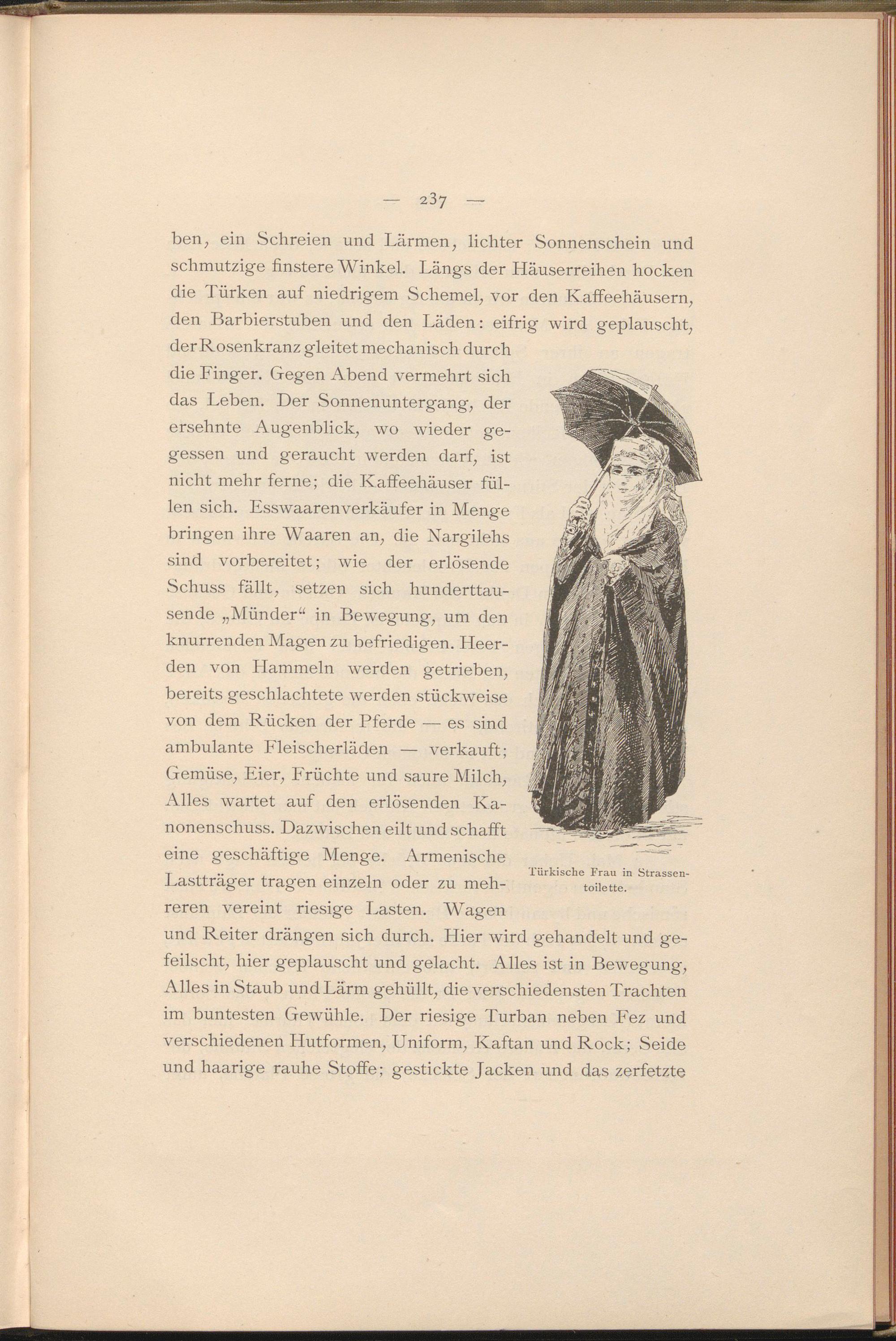 ben, ein Schreien und Lärmen, lichter Sonnenschein und schmutzige finstere Winkel. Längs der Häuserreihen hocken die Türken auf niedrigem Schemel, vor den Kaffeehäusern, den Barbierstuben und den Läden: eifrig wird geplauscht, der Rosenkranz gleitet mechanisch durch die Finger. Gegen Abend vermehrt sich das Leben. Der Sonnenuntergang, der ersehnte Augenblick, wo wieder gegessen und geraucht werden darf, ist nicht mehr ferne; die Kaffeehäuser füllen sich. Esswaarenverkäufer in Menge bringen ihre Waaren an, die Nargilehs sind vorbereitet; wie der erlösende Schuss fällt, setzen sich hunderttausende „Münder“ in Bewegung, um den knurrenden Magen zu befriedigen. Heer- den von Hammeln werden getrieben, bereits geschlachtete werden stückweise von dem Rücken der Pferde — es sind ambulante Fleischerläden — verkauft;