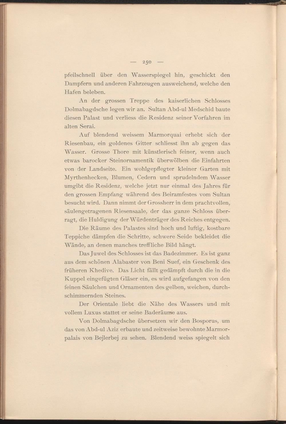 Auf blendend weissem Marmorquai erhebt sich der Riesenbau, ein goldenes Gitter schliesst ihn ab gegen das Wasser. Grosse Thore mit künstlerisch feiner, wenn auch etwas barocker Steinornamentik überwölben die Einfahrten von der Landseite. Ein wohlgepflegter kleiner Garten mit Myrthenhecken, Blumen, Cedern und sprudelndem Wasser umgibt die Residenz, welche jetzt nur einmal des Jahres für den grossen Empfang während des Beiramfestes vom Sultan besucht wird. Dann nimmt der Grossherr in dem prachtvollen, säulengetragenen Riesensaale, der das ganze Schloss überragt, die Huldigung der Würdenträger des Reiches entgegen.