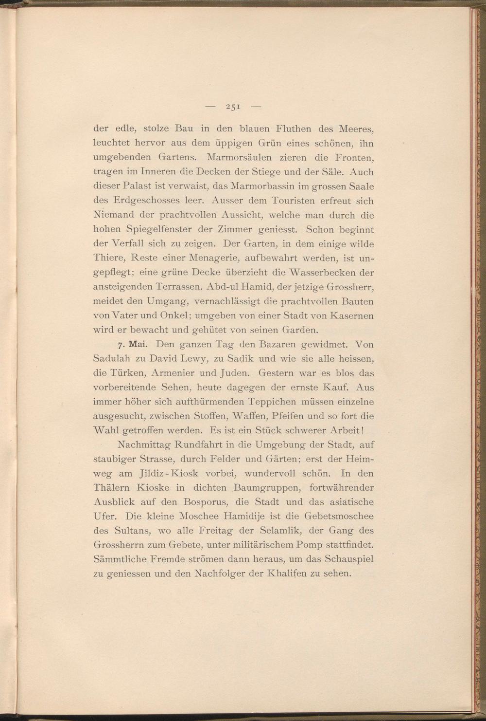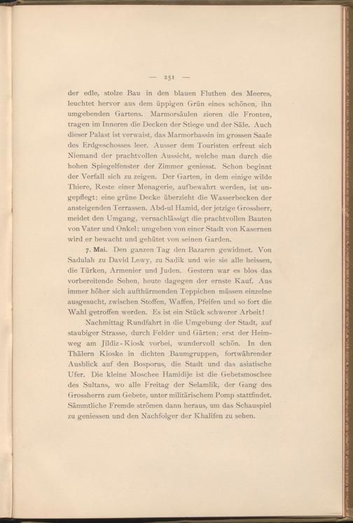 Nachmittag Rundfahrt in die Umgebung der Stadt, auf staubiger Strasse, durch Felder und Gärten; erst der Heimweg am Jildiz-Kiosk vorbei, wundervoll schön. In den Thälern Kioske in dichten Baumgruppen, fortwährender Ausblick auf den Bosporus, die Stadt und das asiatische Ufer. Die kleine Moschee Hamidije ist die Gebetsmoschee des Sultans, wo alle Freitag der Selamlik, der Gang des Grossherrn zum Gebete, unter militärischem Pomp stattfindet. Sämmtliche Fremde strömen dann heraus, um das Schauspiel zu geniessen und den Nachfolger der Khalifen zu sehen.