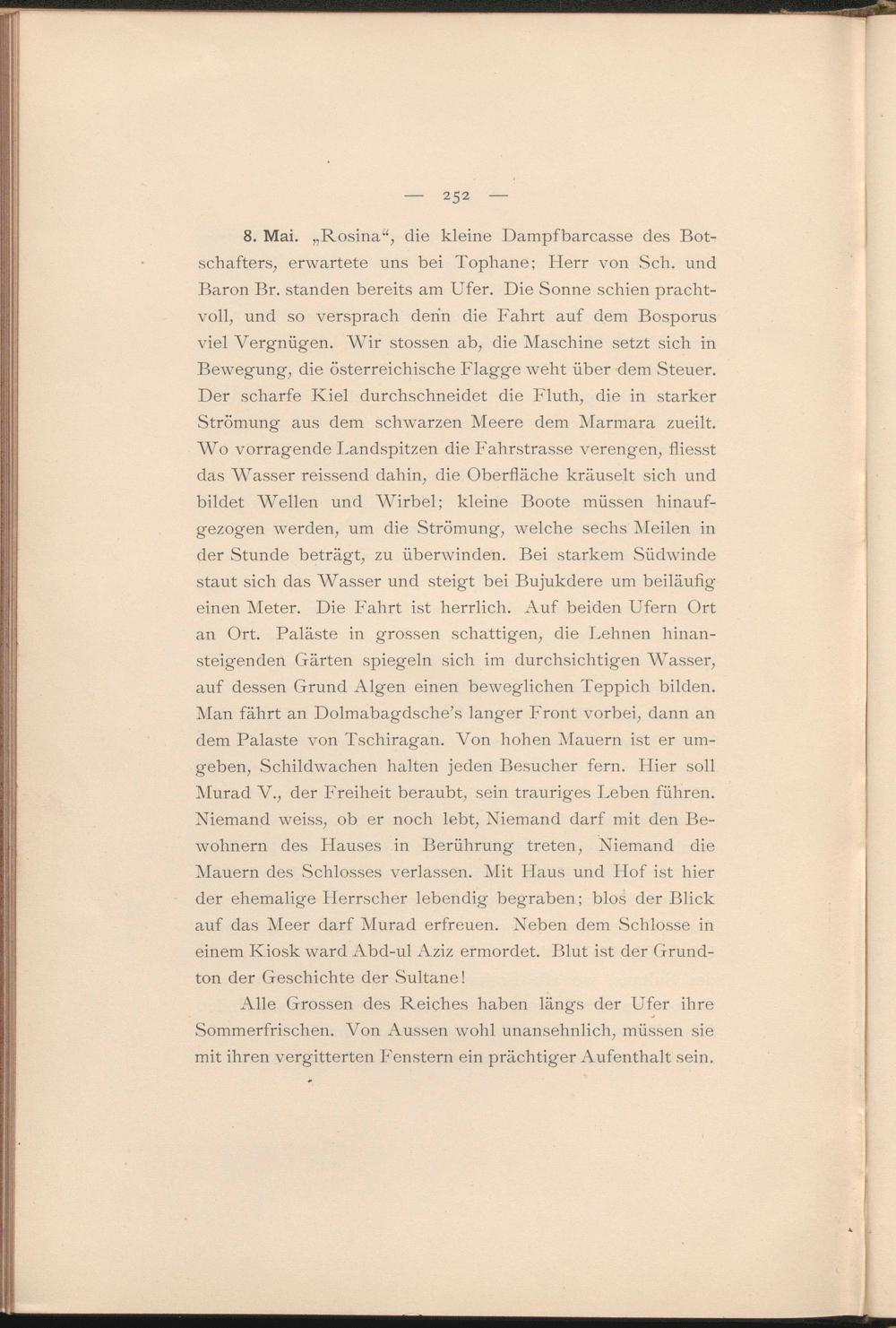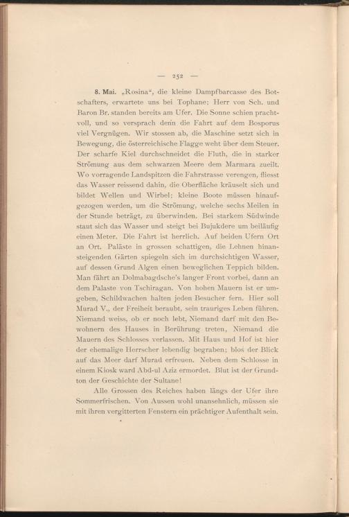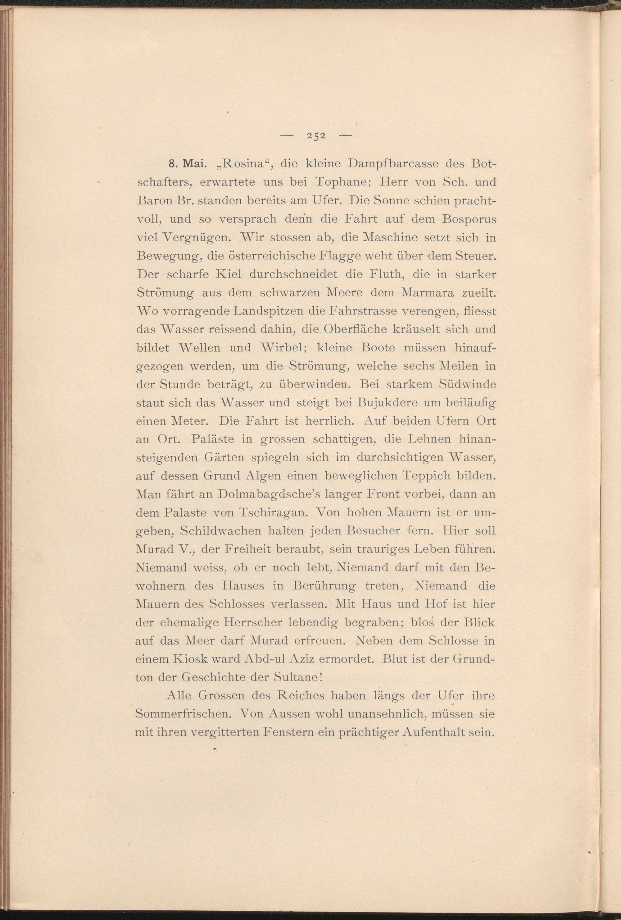 8. Mai. „Rosina“, die kleine Dampfbarcasse des Botschafters; erwartete uns bei Tophane; Herr von Sch. und Baron Br. standen bereits am Ufer. Die Sonne schien prachtvoll; und so versprach denn die Fahrt auf dem Bosporus viel Vergnügen. Wir stossen ab, die Maschine setzt sich in Bewegung, die österreichische Flagge weht über dem Steuer. Der scharfe Kiel durchschneidet die Fluth, die in starker Strömung aus dem schwarzen Meere dem Marmara zueilt. Wo vorragende Landspitzen die Fahrstrasse verengen, fliesst das Wasser reissend dahin, die Oberfläche kräuselt sich und bildet Wellen und Wirbel; kleine Boote müssen hinaufgezogen werden, um die .Strömung, welche sechs Meilen in der Stunde beträgt, zu überwinden. Bei starkem Südwinde staut sich das Wasser und steigt bei Bujukdere um beiläufig einen Meter. Die Fahrt ist herrlich. Auf beiden Ufern Ort an Ort. Paläste in grossen schattigen, die Lehnen hinansteigenden Gärten spiegeln sich im durchsichtigen Wasser, auf dessen Grund Algen einen beweglichen Teppich bilden. Man fährt an Dolmabagdsche’s langer Front vorbei, dann an dem Palaste von Tschiragan. Von hohen Mauern ist er umgeben, Schildwachen halten jeden Besucher fern. Hier soll Murad V., der Freiheit beraubt, sein trauriges Leben führen. Niemand weiss, ob er noch lebt, Niemand darf mit den Bewohnern des Plauses in Berührung treten, Niemand die Mauern des Schlosses verlassen. Mit Haus und Hof ist hier der ehemalige Herrscher lebendig begraben; blos der Blick auf das Meer darf Murad erfreuen. Neben dem Schlosse in einem Kiosk ward Abd-ul Aziz ermordet. Blut ist der Grundton der Geschichte der Sultane!