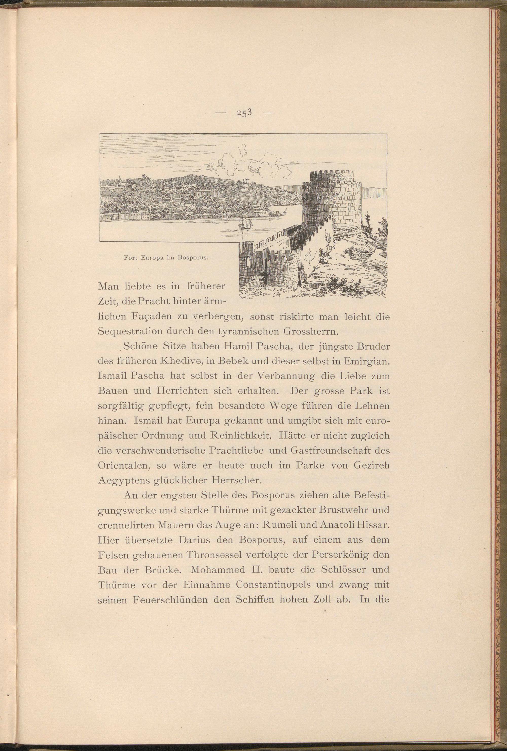 An der engsten Stelle des Bosporus ziehen alte Befestigungswerke und starke Thürme mit gezackter Brustwehr und crennelirten Mauern das Auge an: Rumeli und Anatoli Hissar. Hier übersetzte Darius den Bosporus, auf einem aus dem Felsen gehauenen Thronsessel verfolgte der Perserkönig den Bau der Brücke. Mohammed II. baute die Schlösser und Thürme vor der Einnahme Constantinopels und zwang mit seinen Feuerschlünden den Schiffen hohen Zoll ab. In die