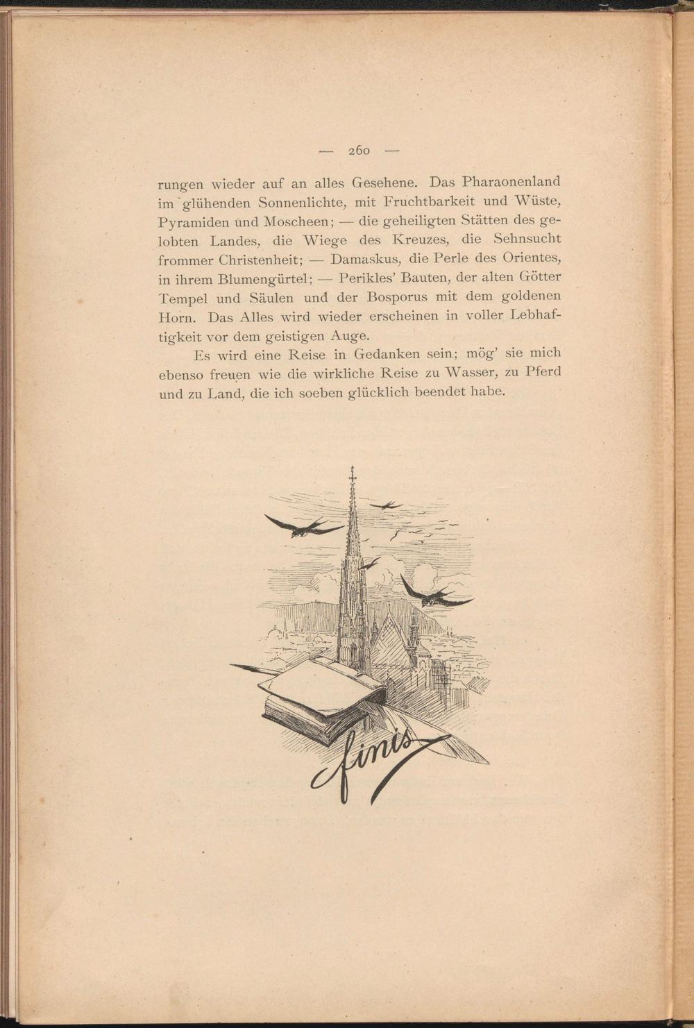rungen wieder auf an alles Gesehene. Das Pharaonenland im glühenden Sonnenlichte, mit Fruchtbarkeit und Wüste, Pyramiden und Moscheen; — die geheiligten Stätten des gelobten Landes, die Wiege des Kreuzes, die Sehnsucht frommer Christenheit; — Damaskus, die Perle des Orientes, in ihrem Blumengürtel; — Perikies’ Bauten, der alten Götter Tempel und Säulen und der Bosporus mit dem goldenen Plorn. Das Alles wird wieder erscheinen in voller Lebhaftigkeit vor dem geistigen Auge.