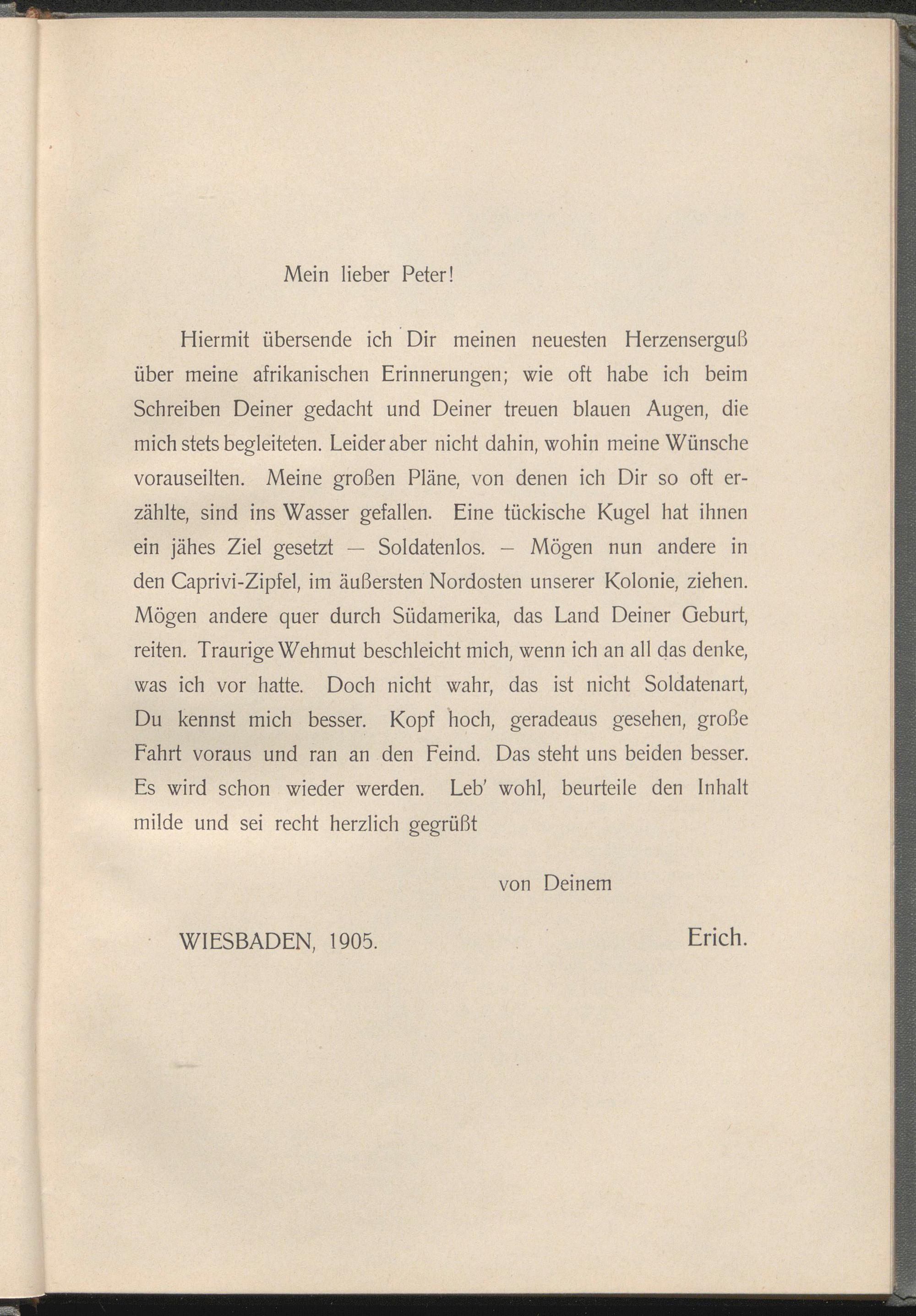 Hiermit übersende ich Dir meinen neuesten Herzenserguß über meine afrikanischen Erinnerungen; wie oft habe ich beim Schreiben Deiner gedacht und Deiner treuen blauen Augen, die mich stets begleiteten. Leider aber nicht dahin, wohin meine Wünsche vorauseilten. Meine großen Pläne, von denen ich Dir so oft erzählte, sind ins Wasser gefallen. Eine tückische Kugel hat ihnen ein jähes Ziel gesetzt — Soldatenlos. - Mögen nun andere in den Caprivi-Zipfel, im äußersten Nordosten unserer Kolonie, ziehen. Mögen andere quer durch Südamerika, das Land Deiner Geburt, reiten. Traurige Wehmut beschleicht mich, wenn ich an all das denke, was ich vor hatte. Doch nicht wahr, das ist nicht Soldatenart, Du kennst mich besser. Kopf hoch, geradeaus gesehen, große Fahrt voraus und ran an den Feind. Das steht uns beiden besser. Es wird schon wieder werden. Leb' wohl, beurteile den Inhalt milde und sei recht herzlich gegrüßt