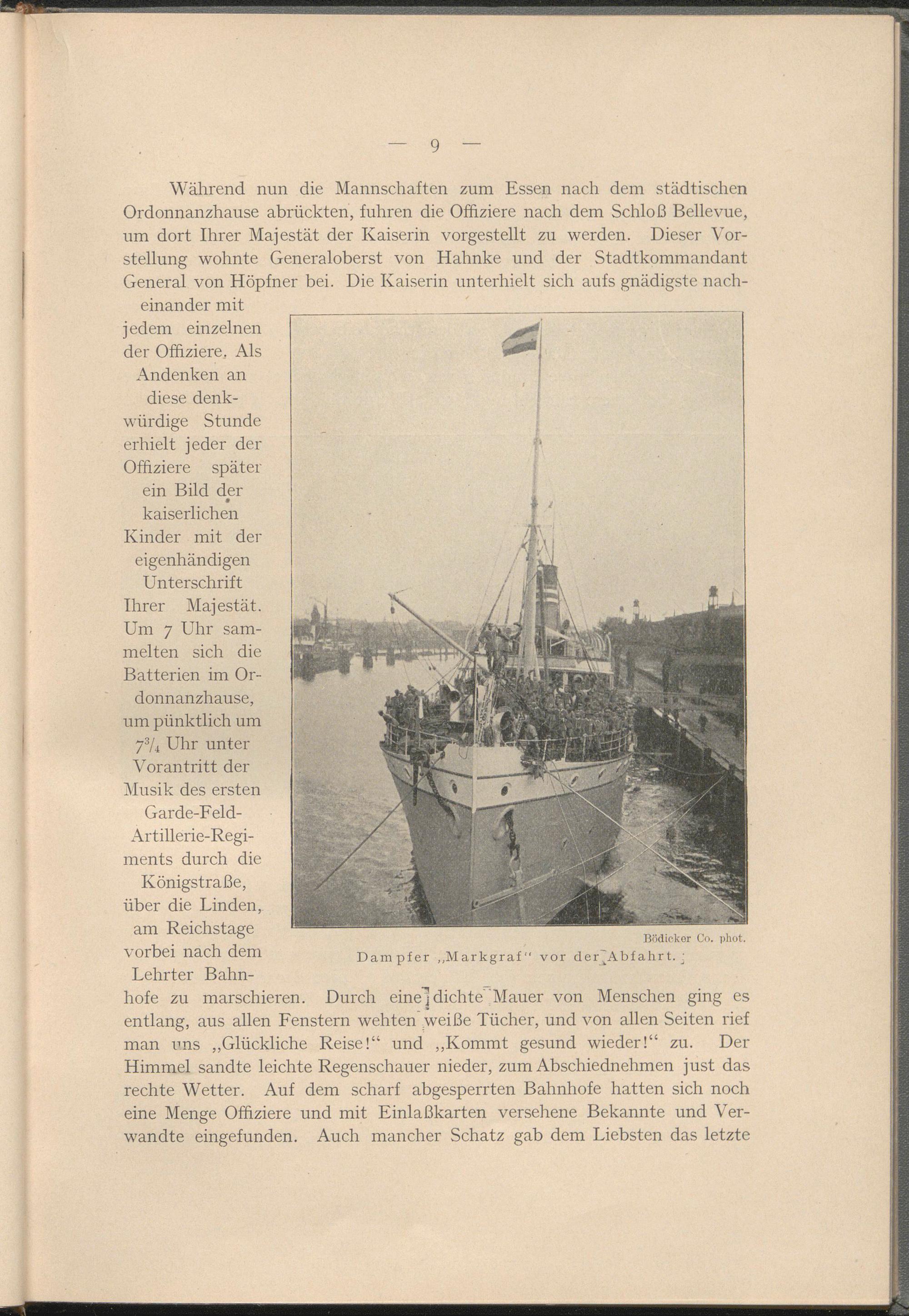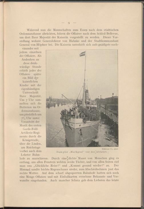 Um 7 Uhr sammelten sich die Batterien im Ordonnanzhause, um pünktlich um 7 3 /* Uhr unter Vorantritt der Musik des ersten Garde-Feld- Artillerie-Regi- ments durch die Königstraße, über die Linden, am Reichstage vorbei nach dem Lehrter Bahnhofe zu marschieren. Durch eine"] dichte'‘Mauer von Menschen ging es entlang, aus allen Fenstern wehten weiße Tücher, und von allen Seiten rief man uns „Glückliche Reise!“ und „Kommt gesund wieder!“ zu. Der Himmel sandte leichte Regenschauer nieder, zum Abschiednehmen just das rechte Wetter. Auf dem scharf abgesperrten Bahnhofe hatten sich noch eine Menge Offiziere und mit Einlaßkarten versehene Bekannte und Verwandte eingefunden. Auch mancher Schatz gab dem Liebsten das letzte