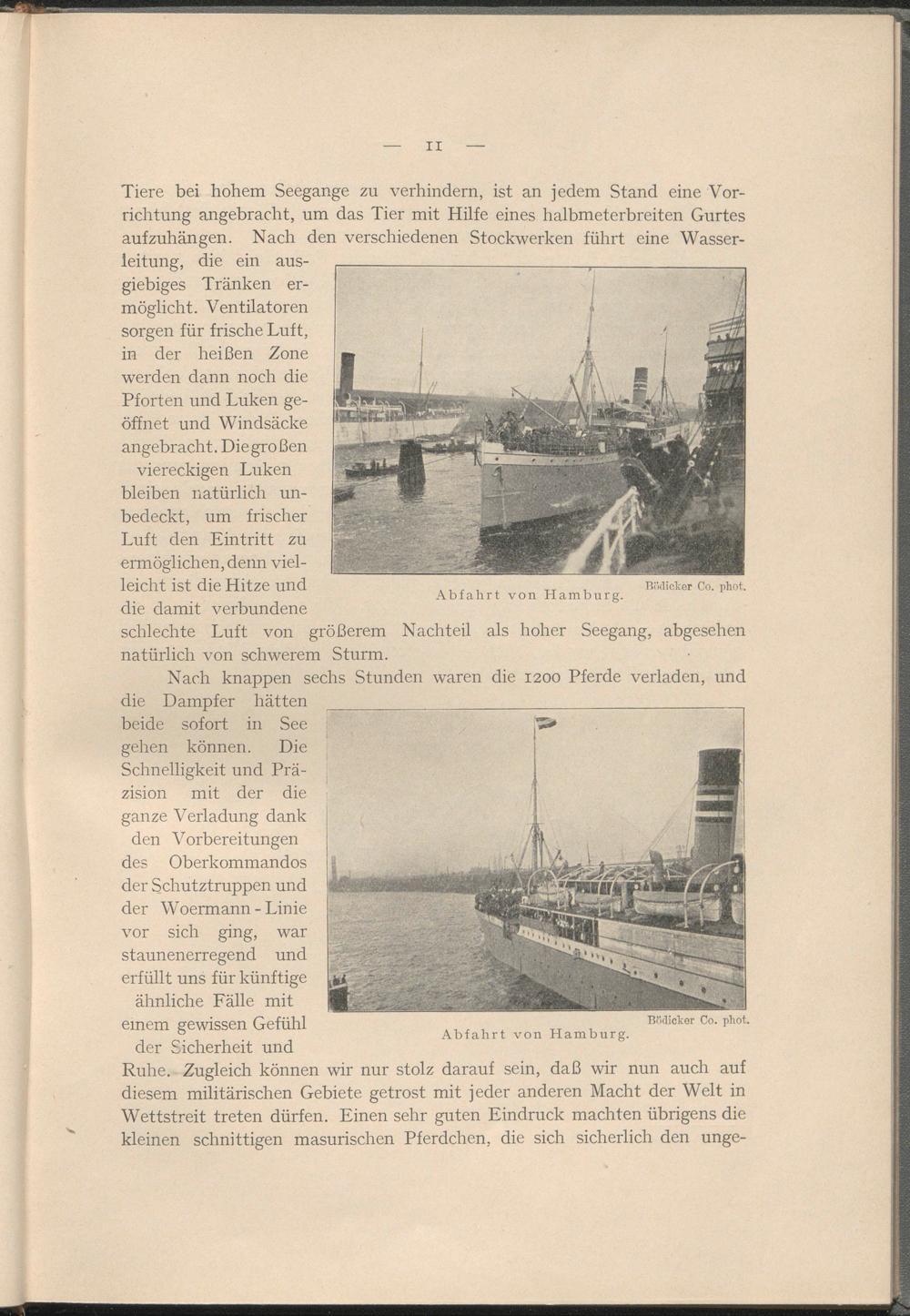 Nach knappen sechs Stunden waren die 1200 Pferde verladen, und die Dampfer hätten beide sofort in See gehen können. Die Schnelligkeit und Präzision mit der die ganze Verladung dank den Vorbereitungen des Oberkommandos der Schutztruppen und der Woermann - Linie vor sich ging, war staunenerregend und erfüllt uns für künftige ähnliche Fälle mit einem gewissen Gefühl der Sicherheit und