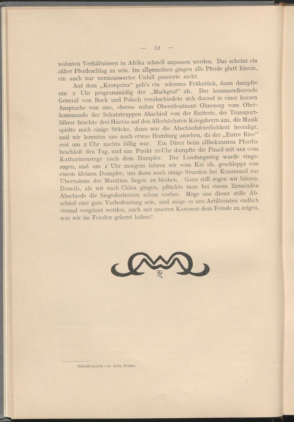 Auf dem „Kronprinz“' gab’s ein solennes Frühstück, dann dampfte um 2 Uhr programmäßig der „Markgraf“ ab. Der kommandierende General von Bock und Polach verabschiedete sich darauf in einer kurzen Ansprache von uns, ebenso nahm Oberstleutnant Ohnesorg vom Oberkommando der Schutztruppen Abschied von der Batterie, der Transportführer brachte drei Hurras auf den Allerhöchsten Kriegsherrn aus, die Musik spielte noch einige Stücke, dann war die Abschiedsfeierlichkeit beendigt, und wir konnten uns noch etwas Hamburg ansehen, da der „Entre Rios“ erst um 2 Uhr nachts fällig war. Ein Diner beim allbekannten Pfordte beschloß den Tag, und um Punkt 10 Uhr dampfte die Pinaß mit uns vom Katharinenstege nach dem Dampfer. Der Landungssteg wurde eingezogen, und um 2 Uhr morgens fuhren wir vom Kai ab, geschleppt von einem kleinen Dampfer, um dann noch einige Stunden bei Krautsand zur Übernahme der Munition liegen zu bleiben. Ganz stül zogen wir hinaus. Damals, als wir nach China gingen, pflückte man bei einem lärmenden Abschiede die Siegeslorbeeren schon vorher. Möge uns dieser stille Abschied eine gute Vorbedeutung sein, und möge es uns Artilleristen endlich einmal vergönnt werden, auch mit unseren Kanonen dem Feinde zu zeigen, was wir im Frieden gelernt haben!