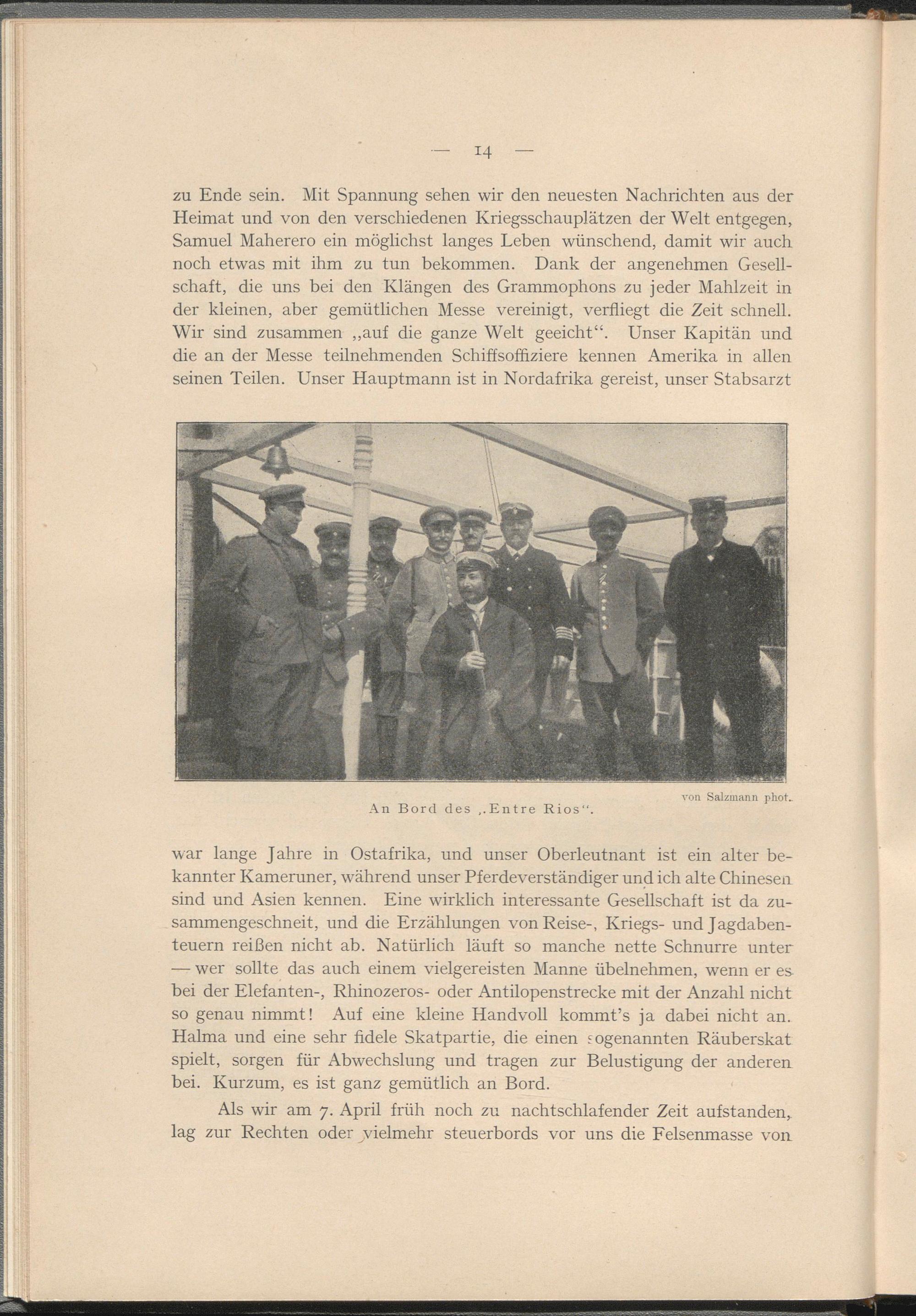 zu Ende sein. Mit Spannung sehen wir den neuesten Nachrichten aus der Heimat und von den verschiedenen Kriegsschauplätzen der Welt entgegen, Samuel Maherero ein möglichst langes Leben wünschend, damit wir auch noch etwas mit ihm zu tun bekommen. Dank der angenehmen Gesellschaft, die uns bei den Klängen des Grammophons zu jeder Mahlzeit in der kleinen, aber gemütlichen Messe vereinigt, verfliegt die Zeit schnell. Wir sind zusammen „auf die ganze Welt geeicht“. Unser Kapitän und die an der Messe teilnehmenden Schiffsoffiziere kennen Amerika in allen seinen Teilen. Unser Hauptmann ist in Nordafrika gereist, unser Stabsarzt