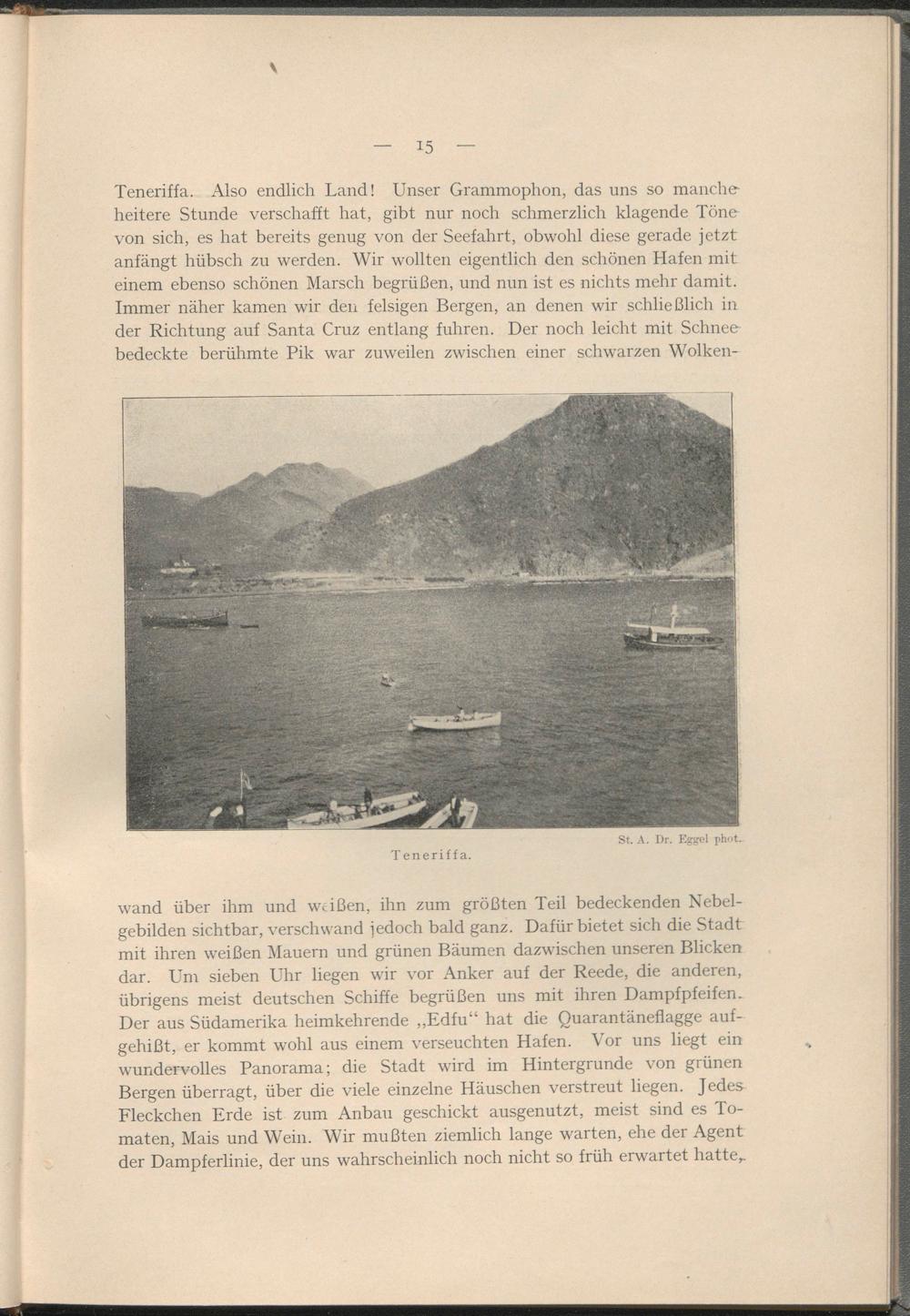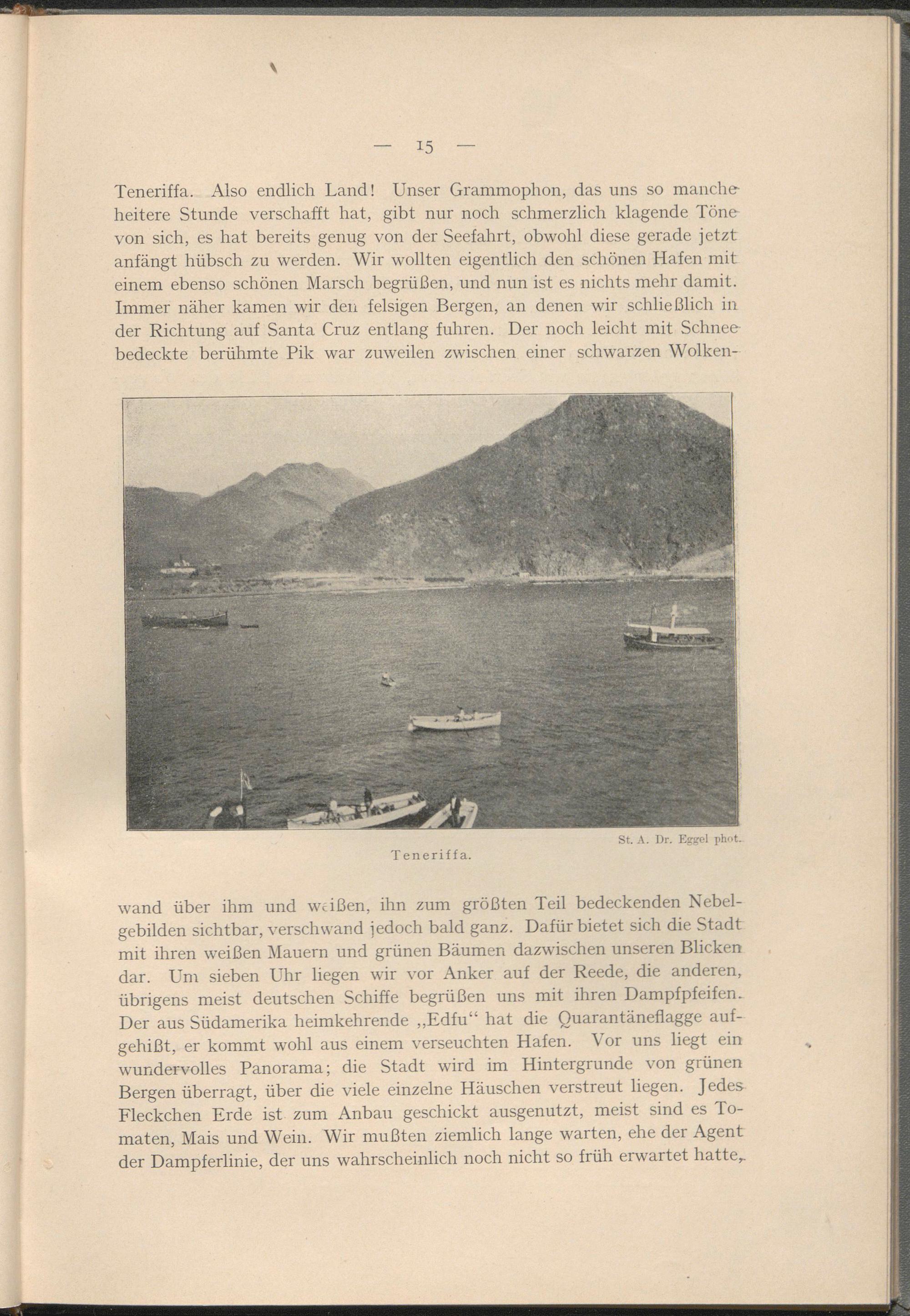 Teneriffa. Also endlich Land! Unser Grammophon, das uns so manche heitere Stunde verschafft hat, gibt nur noch schmerzlich klagende Töne von sich, es hat bereits genug von der Seefahrt, obwohl diese gerade jetzt anfängt hübsch zu werden. Wir wollten eigentlich den schönen Hafen mit einem ebenso schönen Marsch begrüßen, und nun ist es nichts mehr damit. Immer näher kamen wir den felsigen Bergen, an denen wir schließlich in der Richtung auf Santa Cruz entlang fuhren. Der noch leicht mit Schnee bedeckte berühmte Pik war zuweilen zwischen einer schwarzen Wolken-