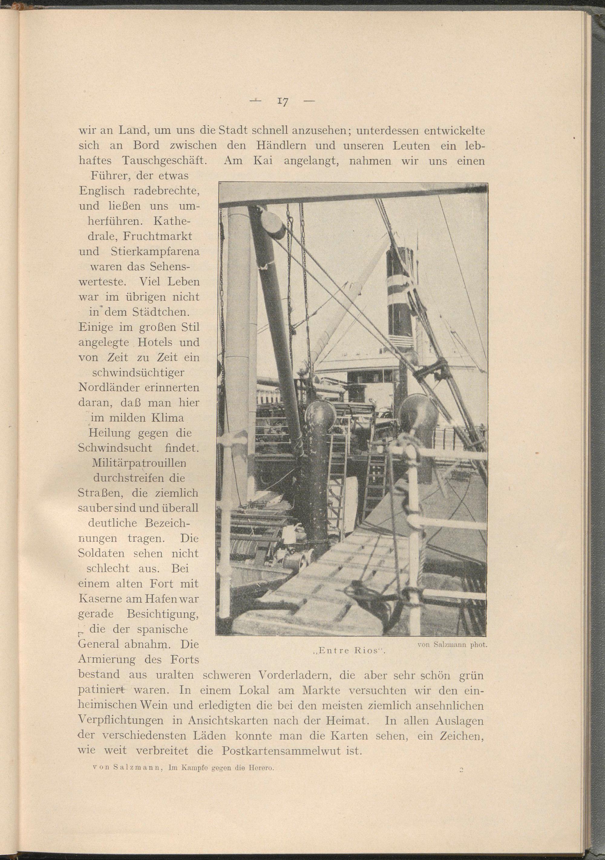 _ die der spanische General abnahm. Die Armierung des Forts bestand aus uralten schweren Vorderladern, die aber sehr schön grün patiniert waren. In einem Lokal am Markte versuchten wir den einheimischen Wein und erledigten die bei den meisten ziemlich ansehnlichen Verpflichtungen in Ansichtskarten nach der Heimat. In allen Auslagen der verschiedensten Läden konnte man die Karten sehen, ein Zeichen, wie weit verbreitet die Postkartensammelwut ist.