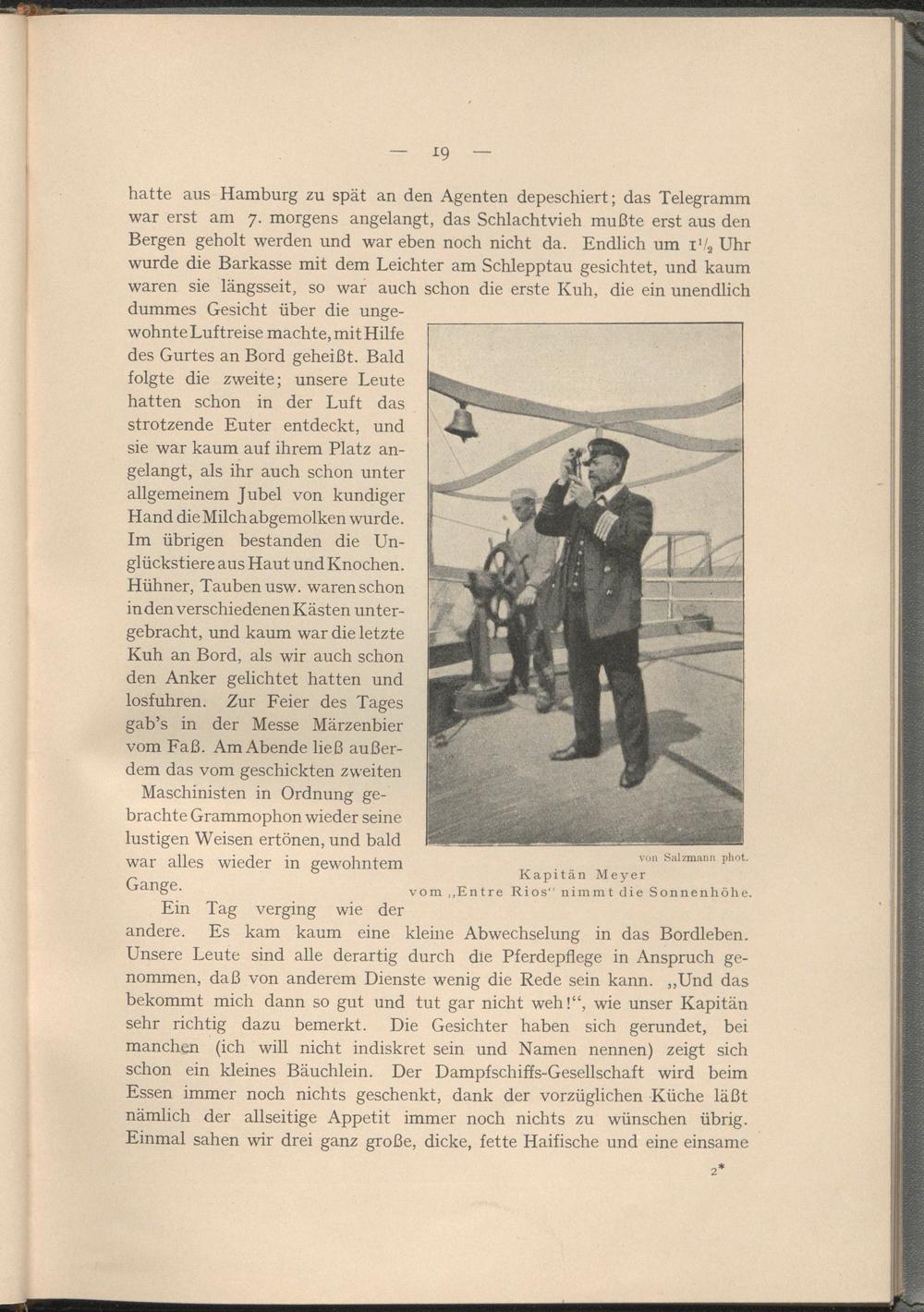 andere. Es kam kaum eine kleine Abwechselung in das Bordleben. Unsere Leute sind alle derartig durch die Pferdepflege in Anspruch genommen, daß von anderem Dienste wenig die Rede sein kann. „Und das bekommt mich dann so gut und tut gar nicht weh!“, wie unser Kapitän sehr richtig dazu bemerkt. Die Gesichter haben sich gerundet, bei manchen (ich will nicht indiskret sein und Namen nennen) zeigt sich schon ein kleines Bäuchlein. Der Dampfschiffs-Gesellschaft wird beim Essen immer noch nichts geschenkt, dank der vorzüglichen Küche läßt nämlich der allseitige Appetit immer noch nichts zu wünschen übrig. Einmal sahen wir drei ganz große, dicke, fette Haifische und eine einsame