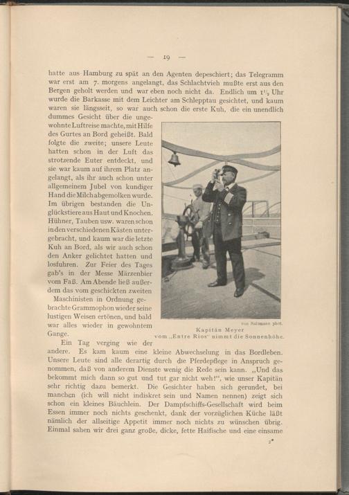 hatte aus Hamburg zu spät an den Agenten depeschiert; das Telegramm war erst am 7. morgens angelangt, das Schlachtvieh mußte erst aus den Bergen geholt werden und war eben noch nicht da. Endlich um i‘/ 2 Uhr wurde die Barkasse mit dem Leichter am Schlepptau gesichtet, und kaum waren sie längsseit, so war auch schon die erste Kuh, die ein unendlich dummes Gesicht über die ungewohnte Luftreise machte, mit Hilfe des Gurtes an Bord geheißt. Bald folgte die zweite; unsere Leute hatten schon in der Luft das strotzende Euter entdeckt, und sie war kaum auf ihrem Platz angelangt, als ihr auch schon unter allgemeinem Jubel von kundiger Hand die Milch abgemolken wurde.