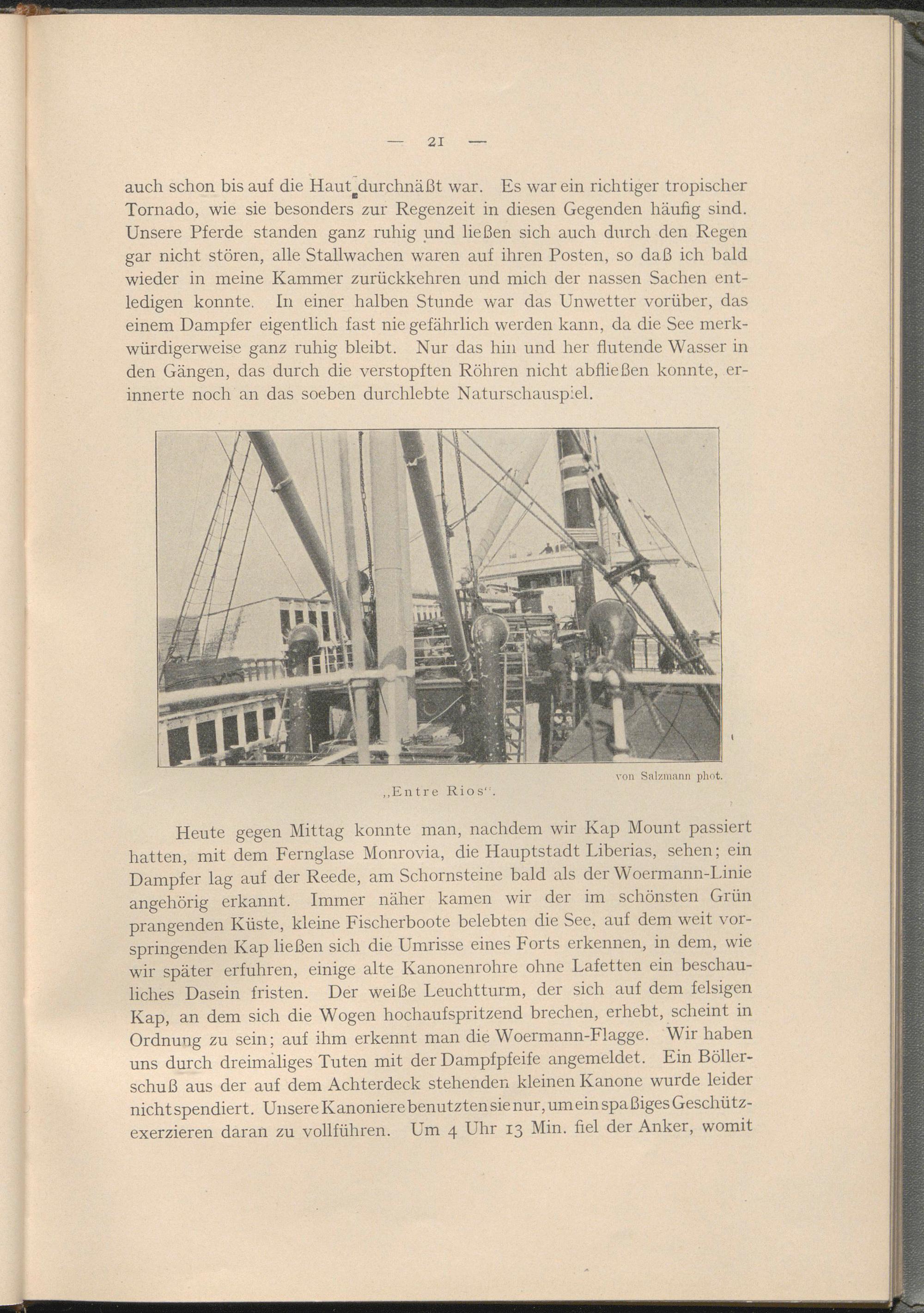 Heute gegen Mittag konnte man, nachdem wir Kap Mount passiert hatten, mit dem Fernglase Monrovia, die Hauptstadt Liberias, sehen; ein Dampfer lag auf der Reede, am Schornsteine bald als der Woermann-Linie angehörig erkannt. Immer näher kamen wir der im schönsten Grün prangenden Küste, kleine Fischerboote belebten die See, auf dem weit vorspringenden Kap ließen sich die Umrisse eines Forts erkennen, in dem, wie wir später erfuhren, einige alte Kanonenrohre ohne Lafetten ein beschauliches Dasein fristen. Der weiße Leuchtturm, der sich auf dem felsigen Kap, an dem sich die Wogen hochaufspritzend brechen, erhebt, scheint in Ordnung zu sein; auf ihm erkennt man die Woermann-Flagge. Wir haben uns durch dreimaliges Tuten mit der Dampfpfeife angemeldet. Ein Böllerschuß aus der auf dem Achterdeck stehenden kleinen Kanone wurde leider nicht spendiert. Unsere Kanoniere benutzten sie nur, um ein spa ßiges Geschützexerzieren daran zu vollführen. Um 4 Uhr 13 Min. fiel der Anker, womit