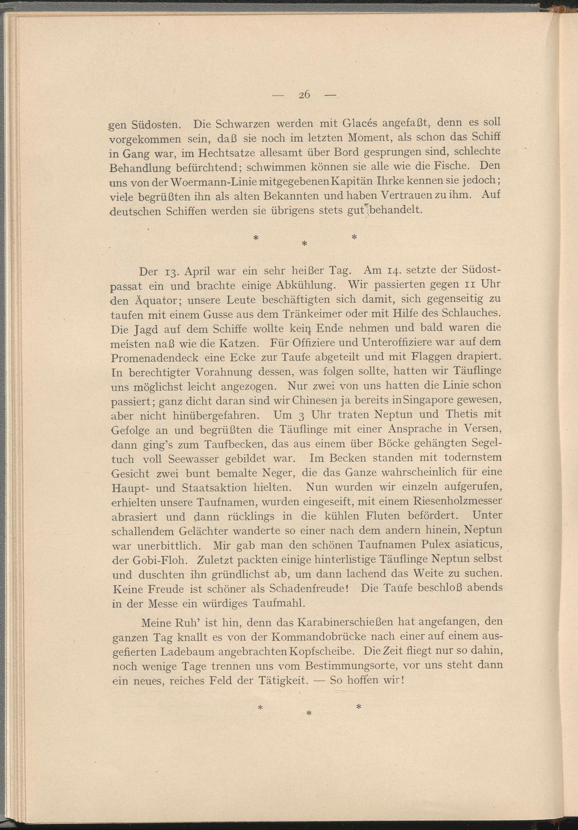Der 13. April war ein sehr heißer Tag. Am 14. setzte der Südostpassat ein und brachte einige Abkühlung. Wir passierten gegen 11 Uhr den Äquator; unsere Leute beschäftigten sich damit, sich gegenseitig zu taufen mit einem Gusse aus dem Tränkeimer oder mit Hilfe des Schlauches. Die Jagd auf dem Schiffe wollte keiq Ende nehmen und bald waren die meisten naß wie die Katzen. Für Offiziere und Unteroffiziere war auf dem Promenadendeck eine Ecke zur Taufe abgeteilt und mit Flaggen drapiert. In berechtigter Vorahnung dessen, was folgen sollte, hatten wir Täuflinge uns möglichst leicht angezogen. Nur zwei von uns hatten die Linie schon passiert; ganz dicht daran sind wir Chinesen ja bereits inSingapore gewesen, aber nicht hinüber gefahren. Um 3 Uhr traten Neptun und Thetis mit Gefolge an und begrüßten die Täuflinge mit einer Ansprache in Versen, dann ging’s zum Taufbecken, das aus einem über Böcke gehängten Segeltuch voll Seewasser gebildet war. Im Becken standen mit todernstem Gesicht zwei bunt bemalte Neger, die das Ganze wahrscheinlich für eine Haupt- und Staatsaktion hielten. Nun wurden wir einzeln aufgerufen, erhielten unsere Taufnamen, wurden eingeseift, mit einem Riesenholzmesser abrasiert und dann rücklings in die kühlen Fluten befördert. Unter schallendem Gelächter wanderte so einer nach dem andern hinein, Neptun war unerbittlich. Mir gab man den schönen Taufnamen Pulex asiaticus, der Gobi-Floh. Zuletzt packten einige hinterlistige Täuflinge Neptun selbst und duschten ihn gründlichst ab, um dann lachend das Weite zu suchen. Keine Freude ist schöner als Schadenfreude! Die Taüfe beschloß abends in der Messe ein würdiges Taufmahl.