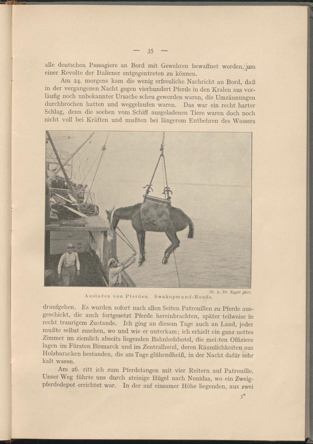 Am 24. morgens kam die wenig erfreuliche Nachricht an Bord, daß in der vergangenen Nacht gegen vierhundert Pferde in den Kralen aus vorläufig noch unbekannter Ursache scheu geworden waren, die Umzäunungen durchbrochen hatten und weggelaufen waren. Das war ein recht harter Schlag, denn die soeben vom Schiff ausgeladenen Tiere waren doch noch nicht voll bei Kräften und mußten bei längerem Entbehren des Wassers