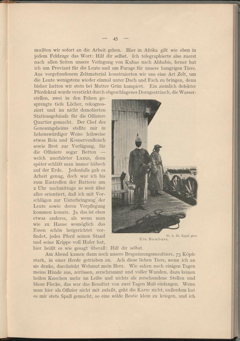 mußten wir sofort an die Arbeit gehen. Hier in Afrika gilt wie eben in jedem Feldzuge das Wort: Hilf dir selbst. Ich telegraphierte also zuerst nach allen Seiten unsere Verlegung von Kubas nach Abbabis, ferner bat ich um Proviant für die Leute und um Furage für unsere hungrigen Tiere. Aus Vorgefundenem Zeltmaterial konstruierten wir uns eine Art Zelt, um die Leute wenigstens wieder einmal unter Dach und Fach zu bringen, denn bisher hatten wir stets bei Mutter Grün kampiert. Ein ziemlich defekter Pferdekral wurde verstärkt durch abgeschlagenes Dorngesträuch, die Wasserstellen, zwei in den Felsen gesprengte tiefe Löcher, rekognosziert und im nicht demolierten Stationsgebäude für die Offiziere Quartier gemacht. Der Chef des Genesungsheims stellte mir in liebenswürdiger Weise leihweise etwas Reis und Konservenfleisch sowie Brot zur Verfügung, für die Offiziere sogar Betten — welch unerhörter Luxus, denn später schläft man immer hübsch auf der Erde. Jedenfalls gab es Arbeit genug, doch war ich bis zum Eintreffen der Batterie um 2 Uhr nachmittags so weit über alles orientiert, daß ich mit Vorschlägen zur Unterbringung der Leute sowie deren Verpflegung kommen konnte. Ja das ist eben etwas anderes, als wenn man wie zu Hause womöglich das Essen schön hergerichtet vorfindet, jedes Pferd seinen Stand und seine Krippe voll Hafer hat, hier heißt es wie gesagt überall: Hilf dir selbst.