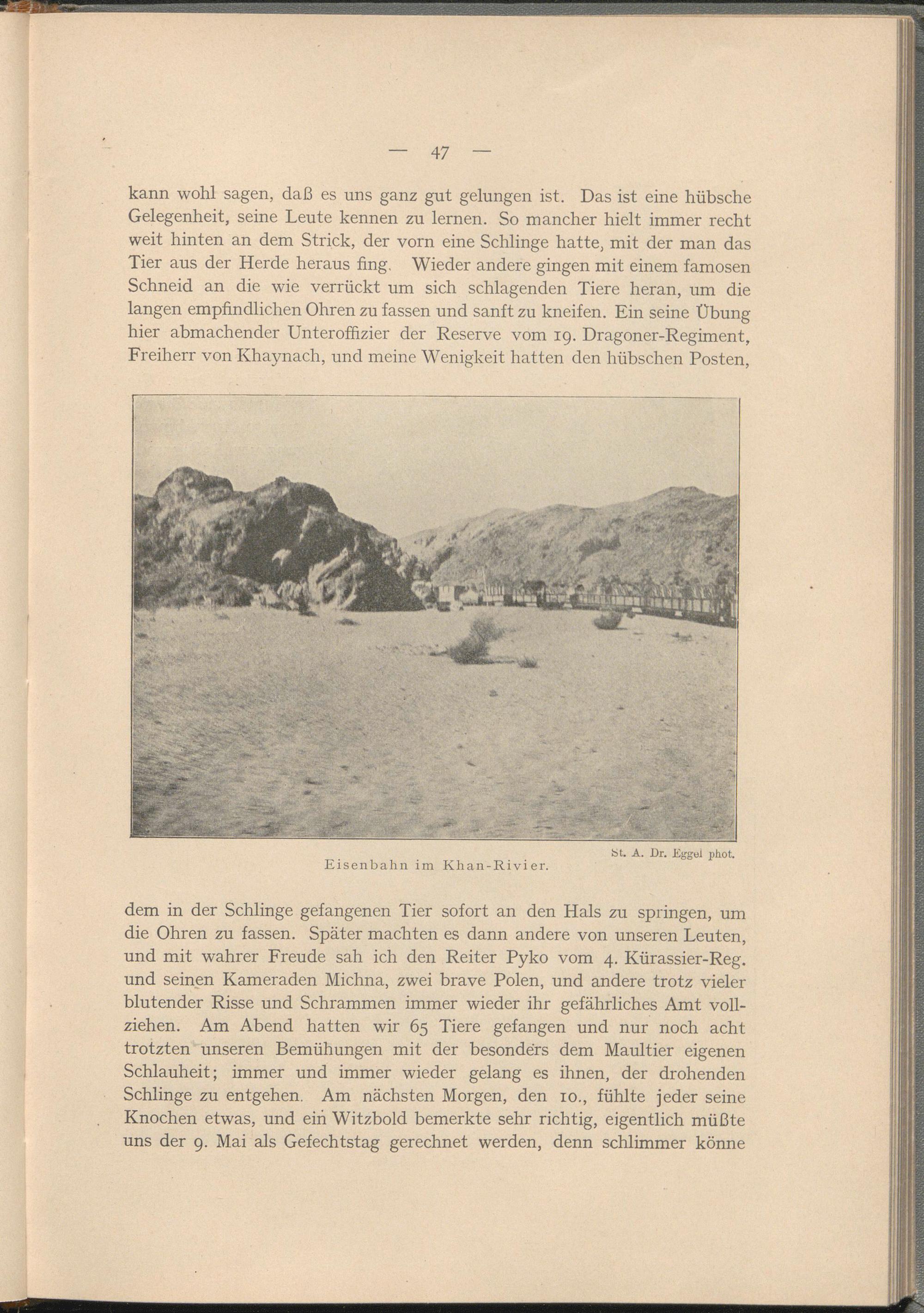dem in der Schlinge gefangenen Tier sofort an den Hals zu springen, um die Ohren zu fassen. Später machten es dann andere von unseren Leuten, und mit wahrer Freude sah ich den Reiter Pyko vom 4. Kürassier-Reg. und seinen Kameraden Michna, zwei brave Polen, und andere trotz vieler blutender Risse und Schrammen immer wieder ihr gefährliches Amt vollziehen. Am Abend hatten wir 65 Tiere gefangen und nur noch acht trotzten unseren Bemühungen mit der besonders dem Maultier eigenen Schlauheit; immer und immer wieder gelang es ihnen, der drohenden Schlinge zu entgehen. Am nächsten Morgen, den 10., fühlte jeder seine Knochen etwas, und ein Witzbold bemerkte sehr richtig, eigentlich müßte uns der 9. Mai als Gefechtstag gerechnet werden, denn schlimmer könne