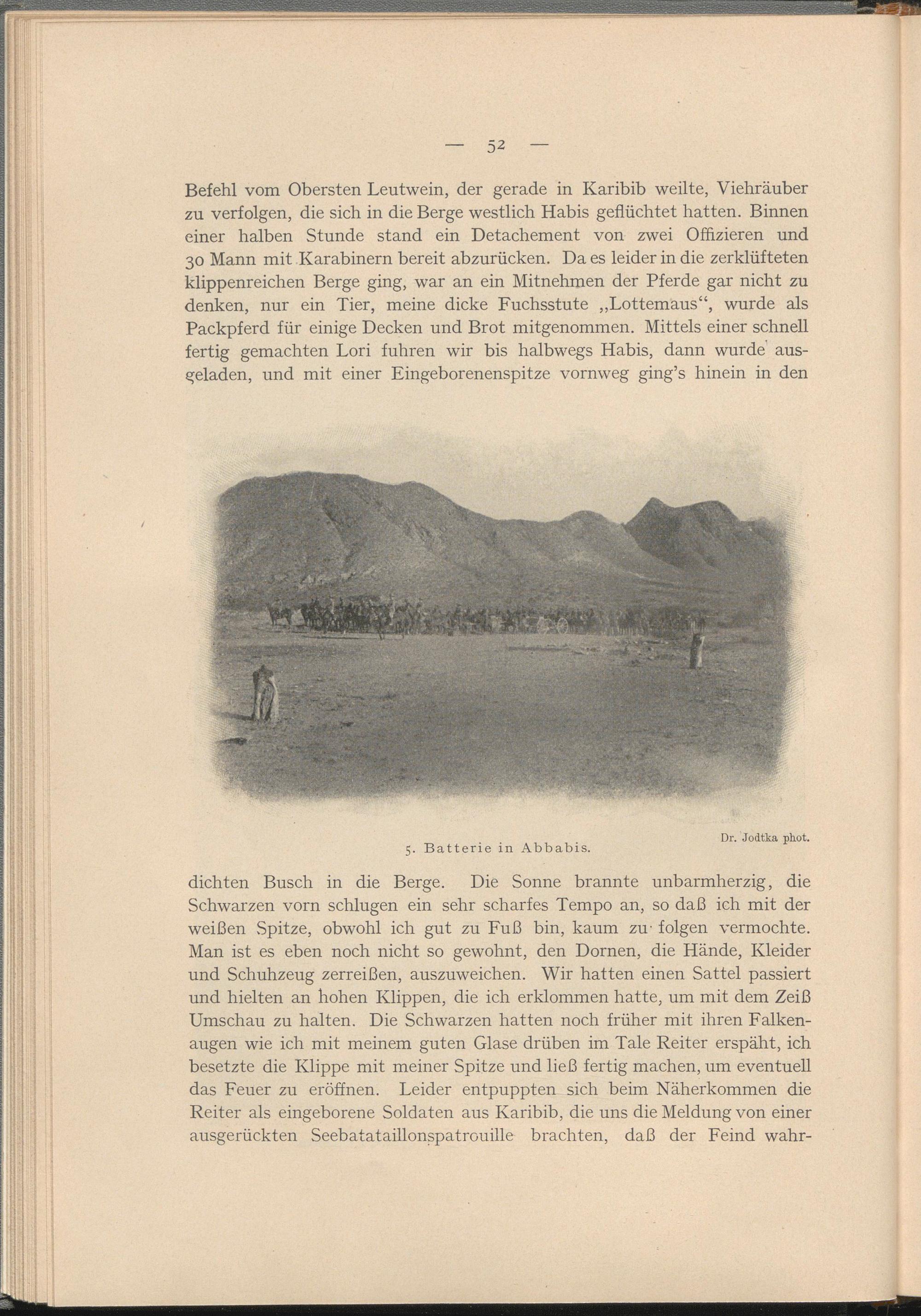Befehl vom Obersten Leutwein, der gerade in Karibib weilte, Viehräuber zu verfolgen, die sich in die Berge westlich Habis geflüchtet hatten. Binnen einer halben Stunde stand ein Detachement von zwei Offizieren und 30 Mann mit Karabinern bereit abzurücken. Da es leider in die zerklüfteten klippenreichen Berge ging, war an ein Mitnehmen der Pferde gar nicht zu denken, nur ein Tier, meine dicke Fuchsstute „Lottemaus“, wurde als Packpferd für einige Decken und Brot mitgenommen. Mittels einer schnell fertig gemachten Lori fuhren wir bis halbwegs Habis, dann wurde ausgeladen, und mit einer Eingeborenenspitze vornweg ging’s hinein in den