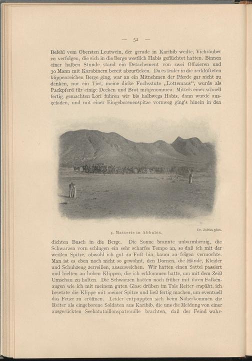 dichten Busch in die Berge. Die Sonne brannte unbarmherzig, die Schwarzen vorn schlugen ein sehr scharfes Tempo an, so daß ich mit der weißen Spitze, obwohl ich gut zu Fuß bin, kaum zu- folgen vermochte. Man ist es eben noch nicht so gewohnt, den Dornen, die Hände, Kleider und Schuhzeug zerreißen, auszuweichen. Wir hatten einen Sattel passiert und hielten an hohen Klippen, die ich erklommen hatte, um mit dem Zeiß Umschau zu halten. Die Schwarzen hatten noch früher mit ihren Falkenaugen wie ich mit meinem guten Glase drüben im Tale Reiter erspäht, ich besetzte die Klippe mit meiner Spitze und ließ fertig machen, um eventuell das Feuer zu eröffnen. Leider entpuppten sich beim Näherkommen die Reiter als eingeborene Soldaten aus Karibib, die uns die Meldung von einer ausgerückten Seebatataillonspatrouille brachten, daß der Feind wahr-