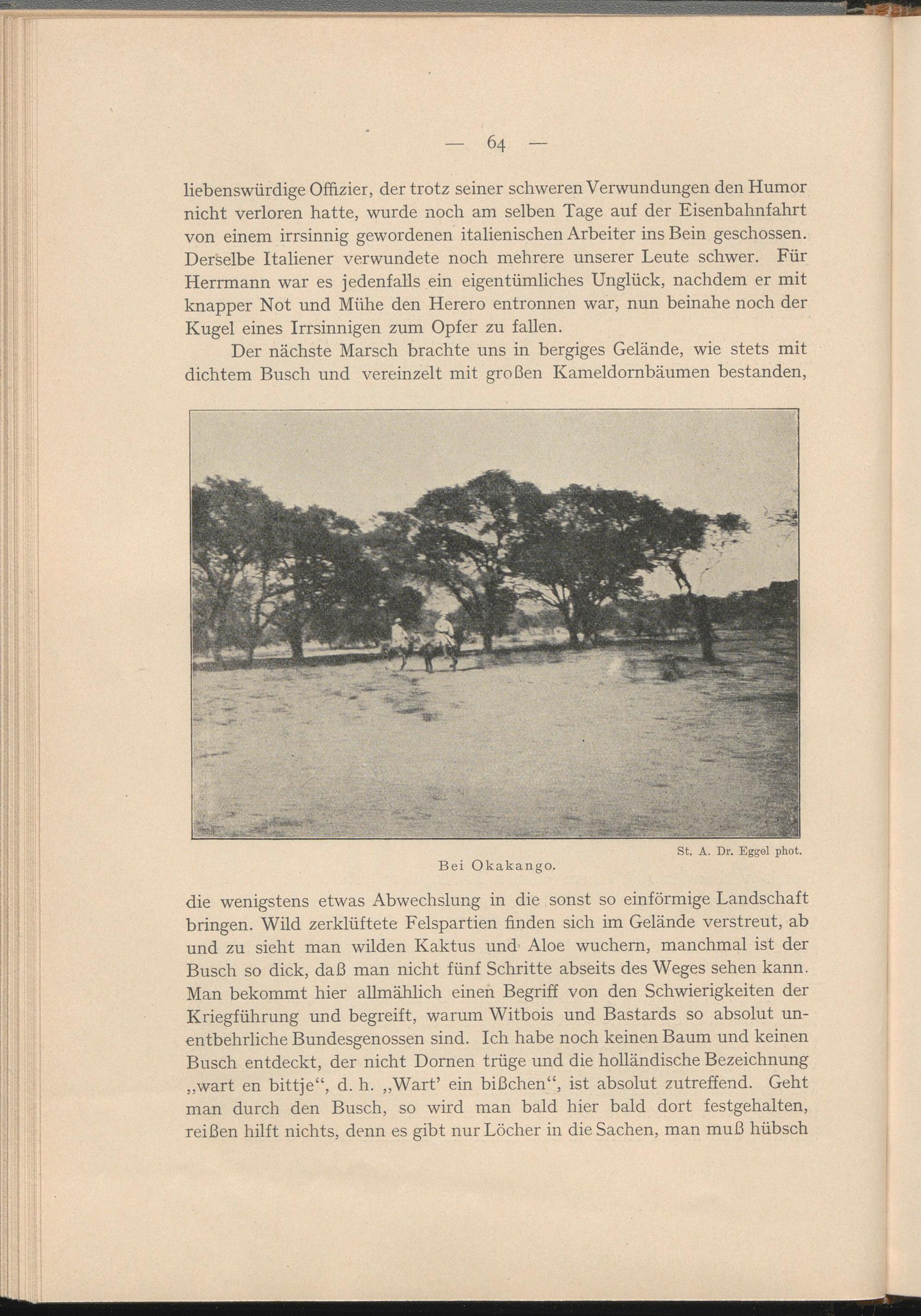 die wenigstens etwas Abwechslung in die sonst so einförmige Landschaft bringen. Wild zerklüftete Felspartien finden sich im Gelände verstreut, ab und zu sieht man wilden Kaktus und Aloe wuchern, manchmal ist der Busch so dick, daß man nicht fünf Schritte abseits des Weges sehen kann. Man bekommt hier allmählich einen Begriff von den Schwierigkeiten der Kriegführung und begreift, warum Witbois und Bastards so absolut unentbehrliche Bundesgenossen sind. Ich habe noch keinen Baum und keinen Busch entdeckt, der nicht Dornen trüge und die holländische Bezeichnung „wart en bittje“, d. h. „Warf ein bißchen“, ist absolut zutreffend. Geht man durch den Busch, so wird man bald hier bald dort festgehalten, reißen hilft nichts, denn es gibt nur Löcher in die Sachen, man muß hübsch