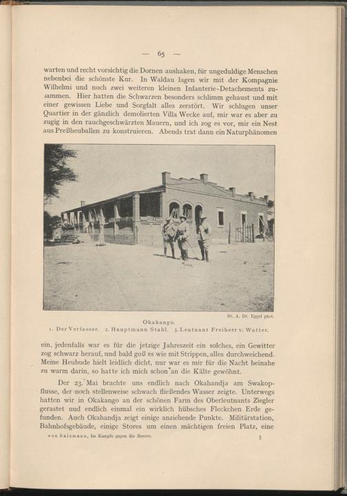 Der 23.'Mai brachte uns endlich nach Okahandja am Swakop- flusse, der noch stellenweise schwach fließendes Wasser zeigte. Unterwegs hatten wir in Okakango an der schönen Farm des Oberleutnants Ziegler gerastet und endlich einmal ein wirklich hübsches Fleckchen Erde gefunden. Auch Okahandja zeigt einige anziehende Punkte. Militärstation, Bahnhofsgebäude, einige Stores um einen mächtigen freien Platz, eine