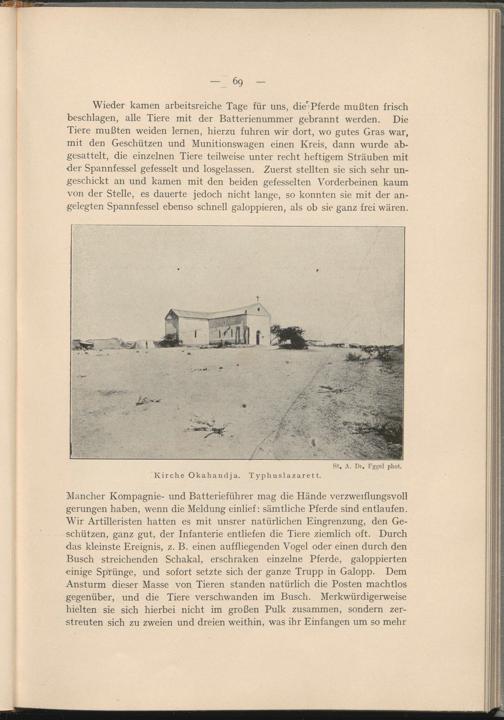 Mancher Kompagnie- und Batterieführer mag die Hände verzweiflungsvoll gerungen haben, wenn die Meldung einlief: sämtliche Pferde sind entlaufen. Wir Artilleristen hatten es mit unsrer natürlichen Eingrenzung, den Geschützen, ganz gut, der Infanterie entliefen die Tiere ziemlich oft. Durch das kleinste Ereignis, z. B. einen auffliegenden Vogel oder einen durch den Busch streichenden Schakal, erschraken einzelne Pferde, galoppierten einige Sprünge, und sofort setzte sich der ganze Trupp in Galopp. Dem Ansturm dieser Masse von Tieren standen natürlich die Posten machtlos gegenüber, und die Tiere verschwanden im Busch. Merkwürdigerweise hielten sie sich hierbei nicht im großen Pulk zusammen, sondern zerstreuten sich zu zweien und dreien weithin, was ihr Einfangen um so mehr